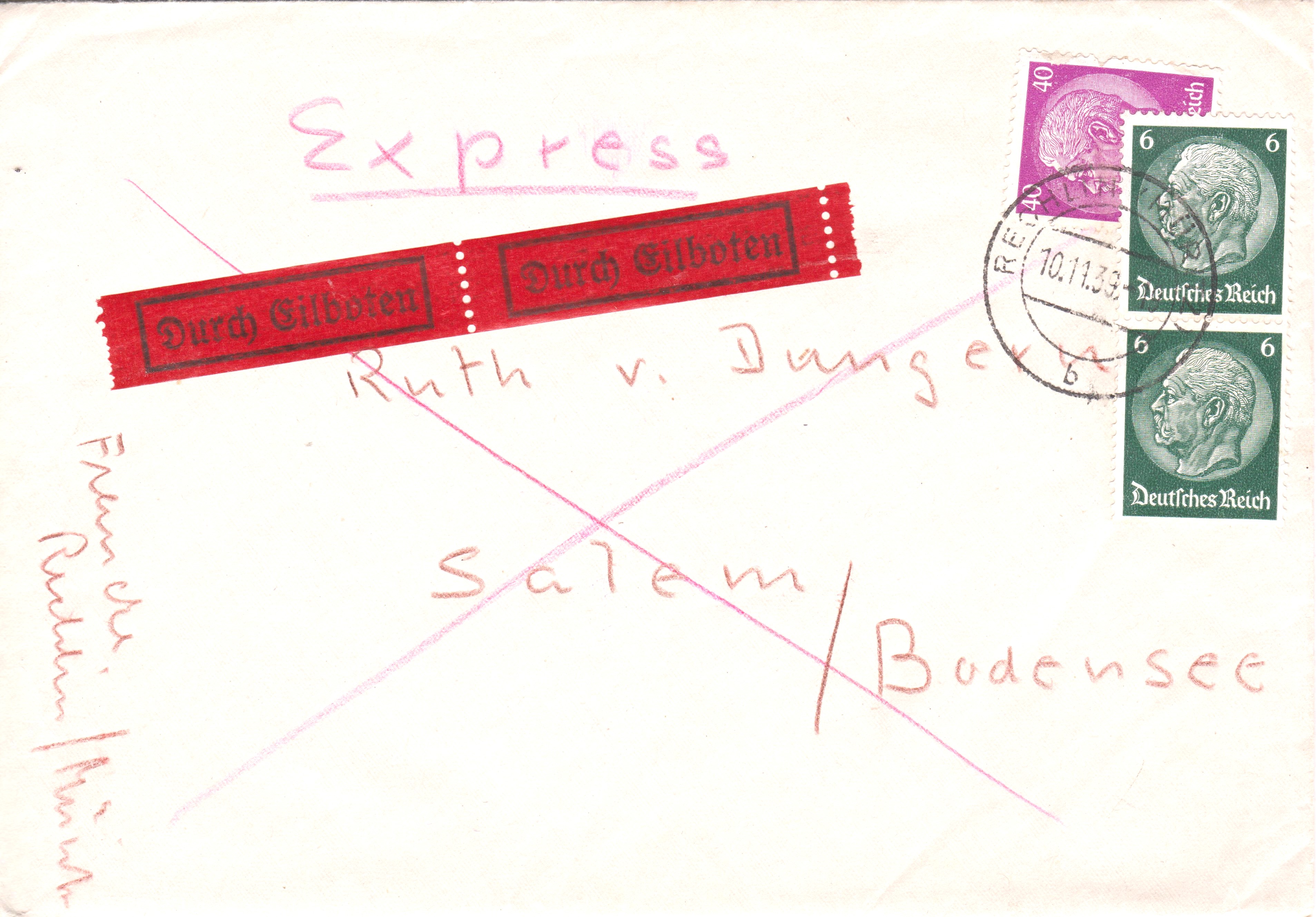 Für diesen am 10.11.1939 aufgegebenen Brief im Fernverkehr von RECHLIN nach Salem/Bodensee, Portostufe 12 Pf, per Eilboten, Porto 40 Pf, ergibt sich die Portostufe 52 Pf, hier dargestellt als Mischfrankatur von 2 x 6 Pf sowie 40 Pf Dauerserie Hindenburg-Medaillon: