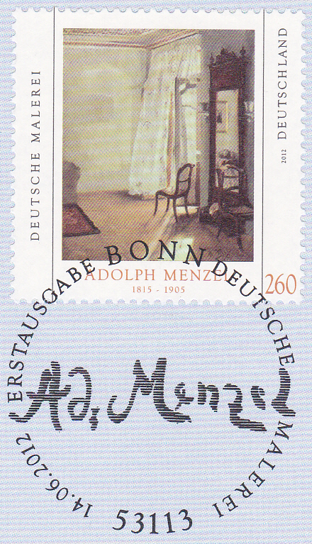 Klappkarte des Vorstandsvorsitzenden der Deutschen Post AG mit der Marke (MiNr 2937) "Das Balkonzimmer" mit dem Gemälde von Adolph Menzel aus der Serie "Deutsche Malerei" und dem Ersttagsonderstempel Bonn.