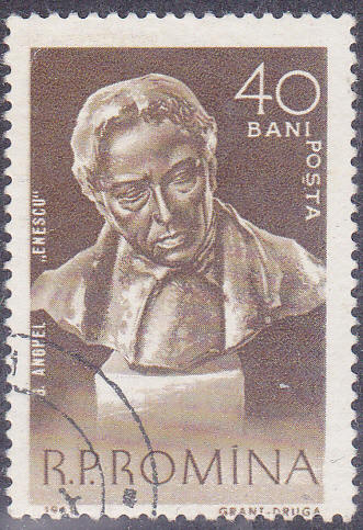 Eine Marke aus Rumänien bildet eine Büste von George Enescu (1881 - 1955, rumänischer Komponist, Violinist und Dirigent) von Gheorghe Anghel ab.