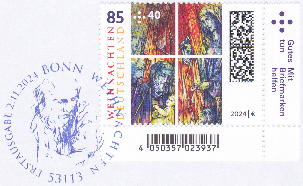 Auf der Weihnachtsmarke 2024 der Deutschen Post (MiNr 3862) wird "Himmlisches Licht", ein Detail eines Kirchenfensters der Abteikirche Tholey, von Mahbuba Elham Maqsoodi.