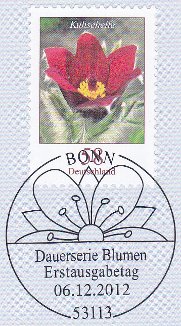 Für die nassklebenden Marken der Dauerserie "Blumen" wurden immer mit dem gleiche Ersttagsonderstempel gestempelt (hier mit dem aus Bonn).