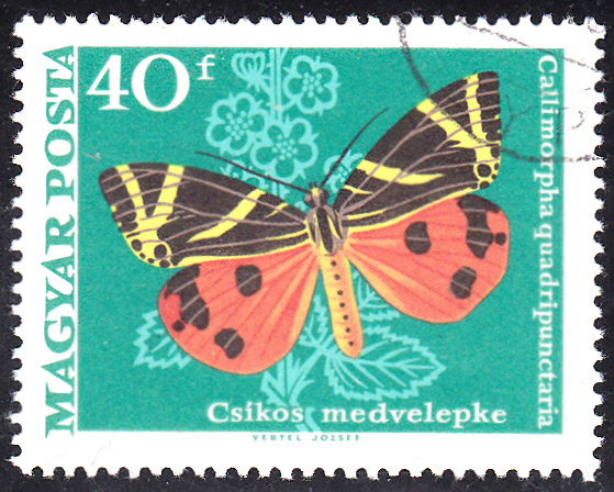 Auch diese Marke aus Ungarn (MiNr 2494 A) zeigt einen Russische Bären (Euplagia quadripunctaria). Im Michel wird als Motivangabe Spanische Flagge (Callimorpha quadripunctaria) genannt.