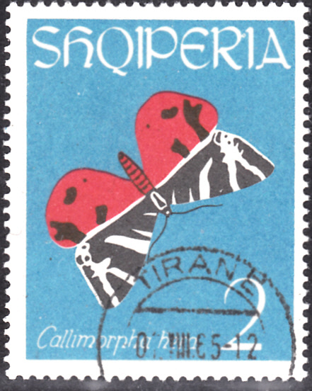 Einen weiterer Russischer Bär (Euplagia quadripunctaria) wird auf dieser Marke aus Albanien (MiNr 774) gezeigt. Auf Marke und Michel werden die lateinischen Namen Callimorpha quadripunctaria bzw Callimorpha hera genannt.