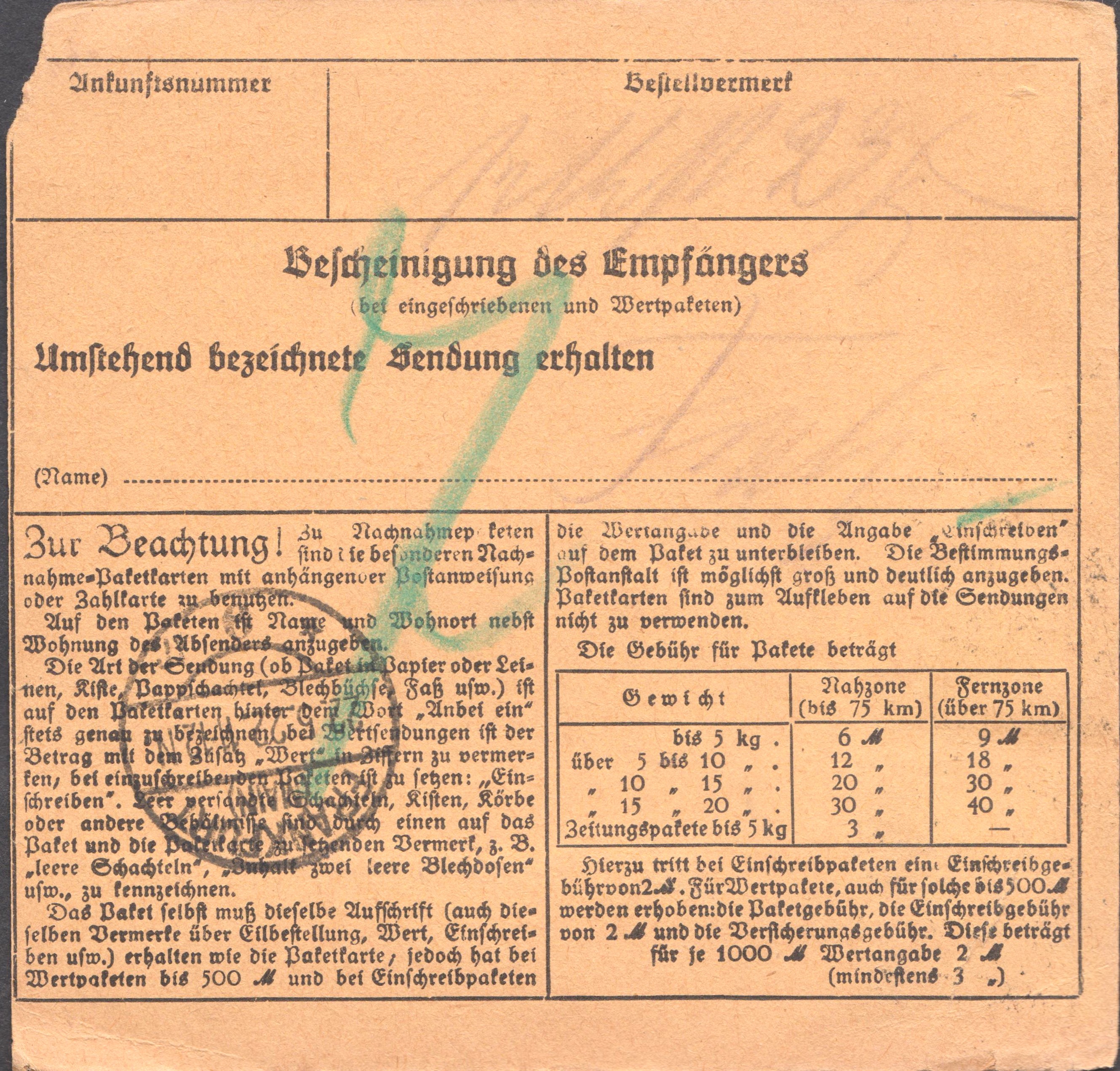 Paketkarte vom 20.05.1922, also aus der Anfangszeit der Inflation, frankiert mit 9 Mark in Form einer Mischfrankatur: