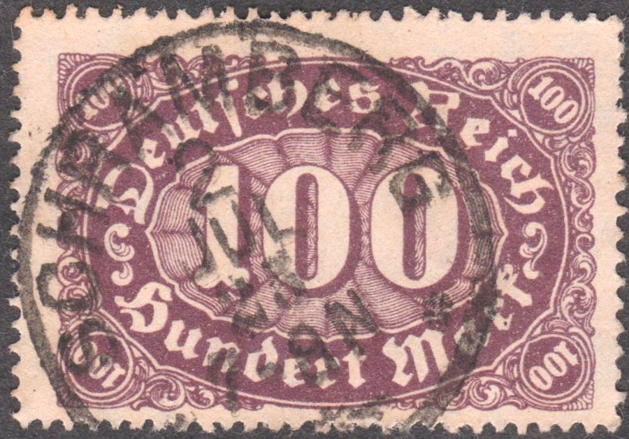 Freimarke Ziffern im Queroval, 100 M, Wasserzeichen 1 (= Rauten), Deutsches Reich MiNr. 219, gestempelt: