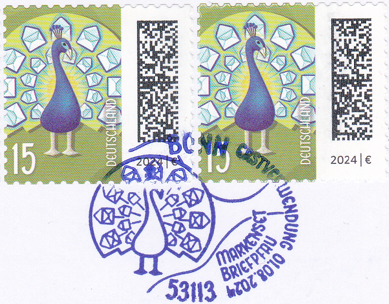 Ebenfalls am 1. August ist eine Marke zu 15 Cent mit dem Motiv "Blauer Pfau (Pavo cristatus) mit Briefen im Schwanz" als selbstklebende Marke (MiNr 3849) erschienen.