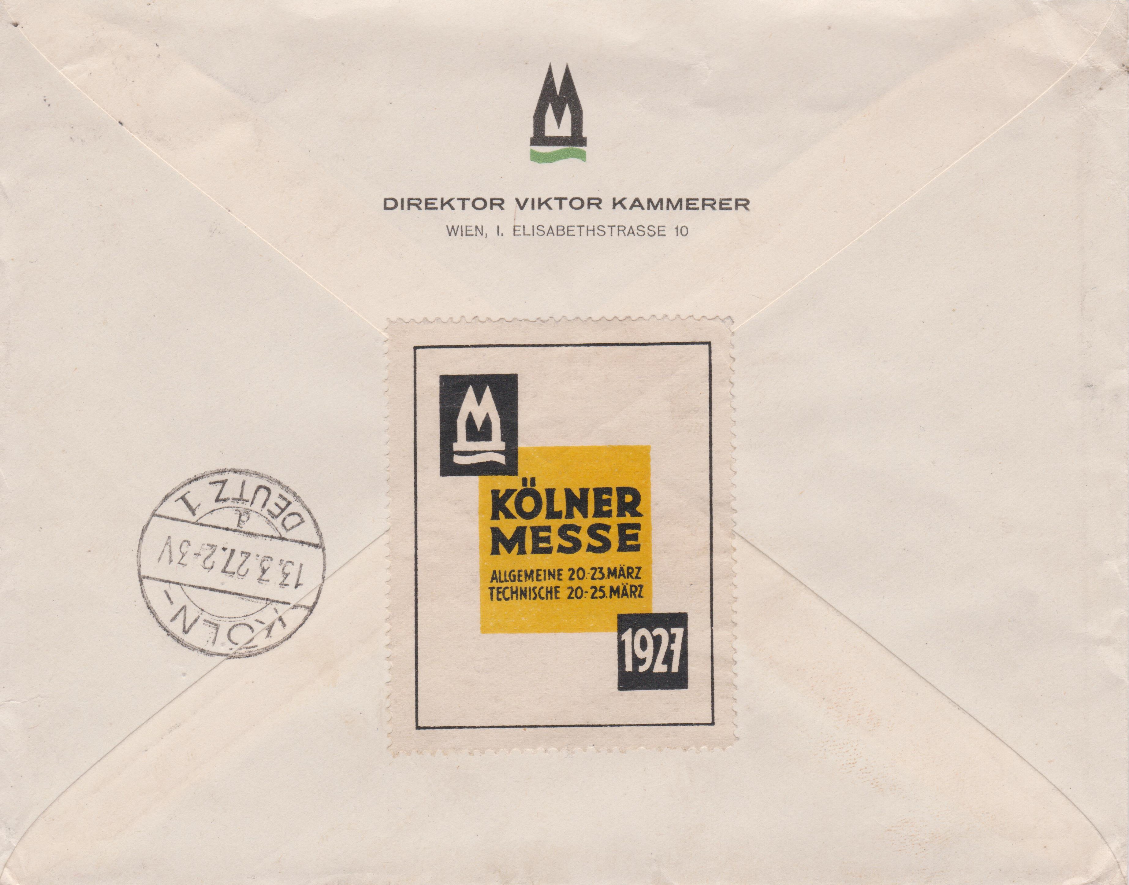 Brief "Durch Eilboten" nach Köln-Deutz (= Kölner Messe), aufgegeben am 11.III.1927 in WIEN: