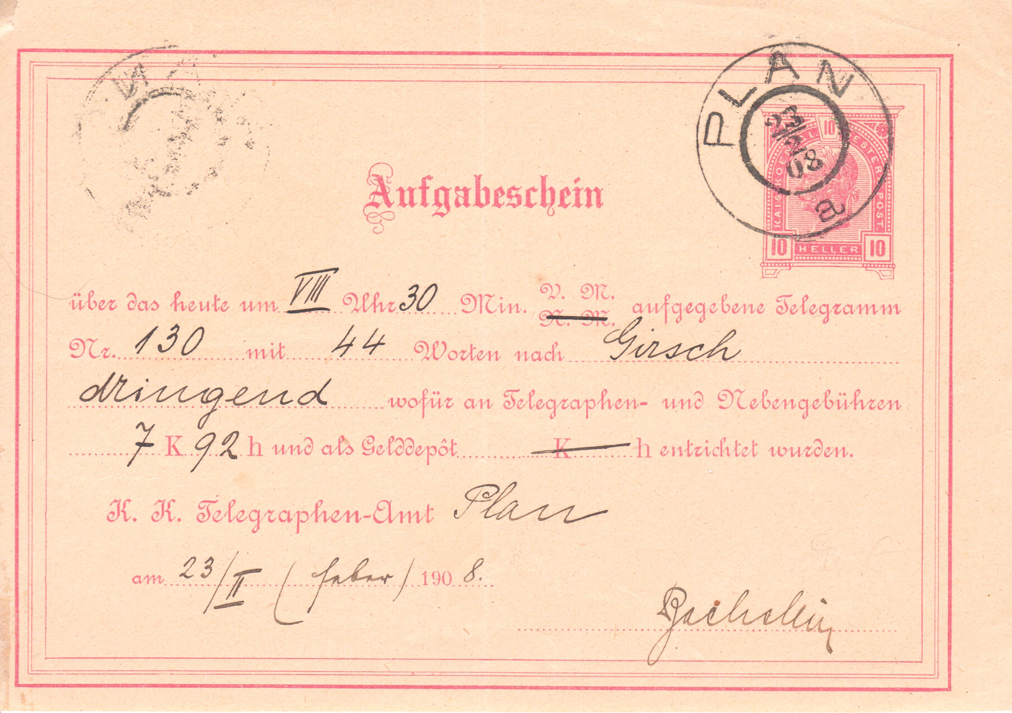 Ganzsache "Aufgabeschein" für ein am 23.02.1908 in PLAN aufgegebenes Telegramm: