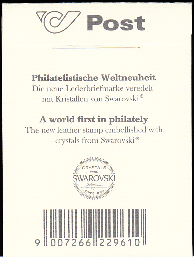 Die österreichische Post hat schon öfter durch ungewöhnliche Ausgaben Aufsehen erregt. Auch am 24. Sept. 2015 erschien mit der Ausgabe "Lederhose" eine ungewöhnliche "Briefmarke" (MiNr 3231). Die Marke zu 630 Cent wurde im Laserdruck auf Alcantara-Leder und mit Swarovski-Kristallen bestückt in Einzelanfertigung als selbstklebende Marke hergestellt.