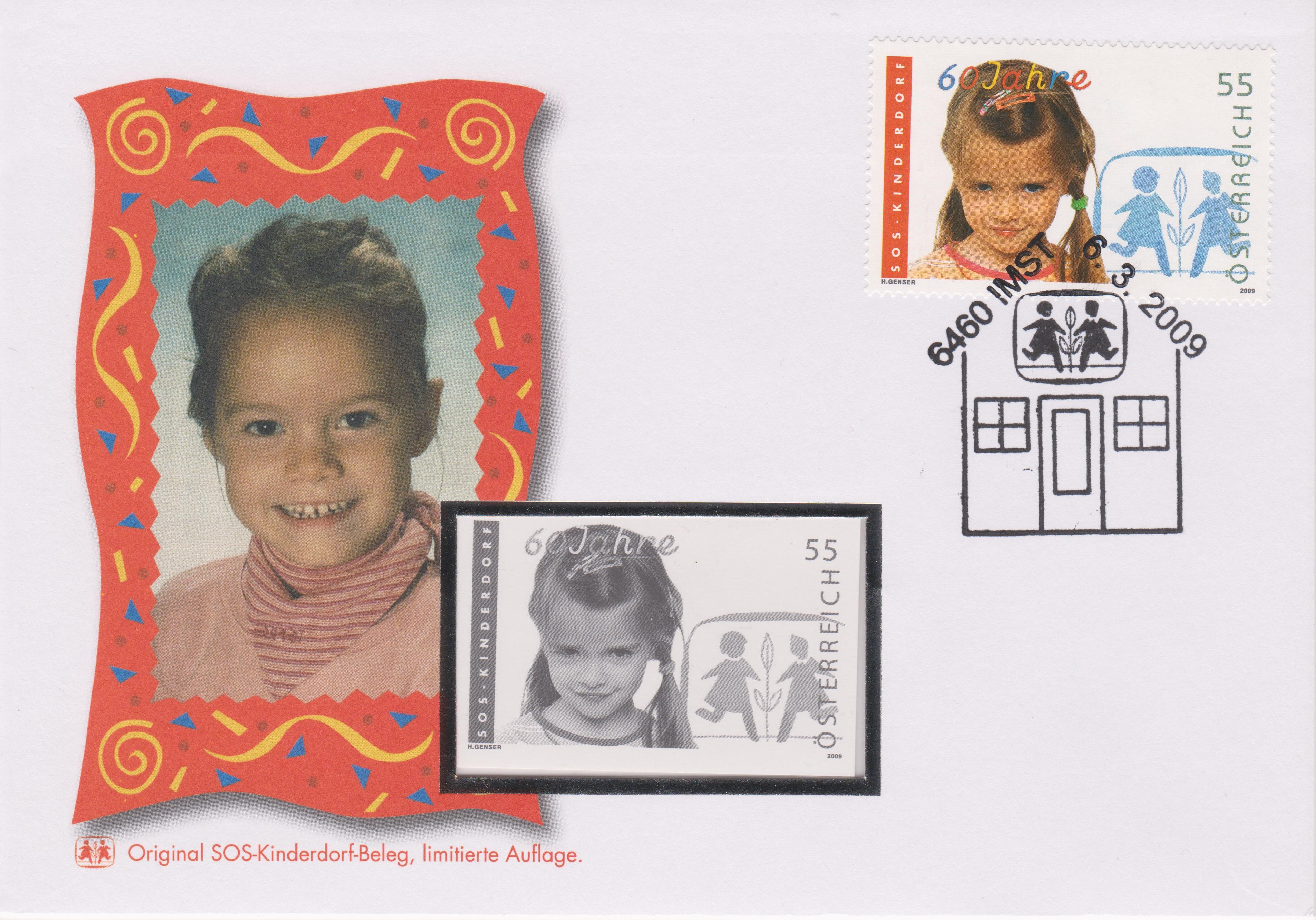 Hier als Beispiel das Postwertzeichen Österreich MiNr. 2793 "60 Jahre SOS-Kinderdorf" mit Poststempel vom Erstausgabetag 06.03.2009 sowie einem Schwarzdruck dieses Postwertzeichens: