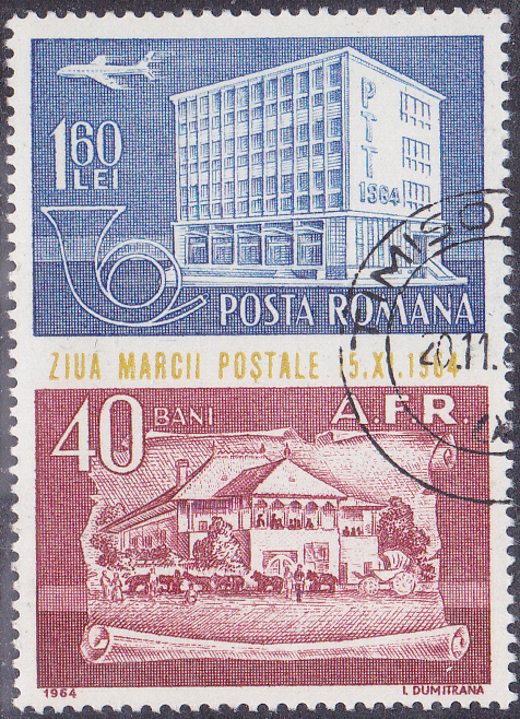 Zum Tag der Briefmarke 1964 ist in Rumänien diese Marke (MiNr 2344) mit einem Flugzeug über einem modernem Postamt und einem Posthorn erschienen. Die Marke wurde senkrecht zusammenhängend gedruckt mit einem Zierfeld, das einen Zuschlag von 40 B aufweist.