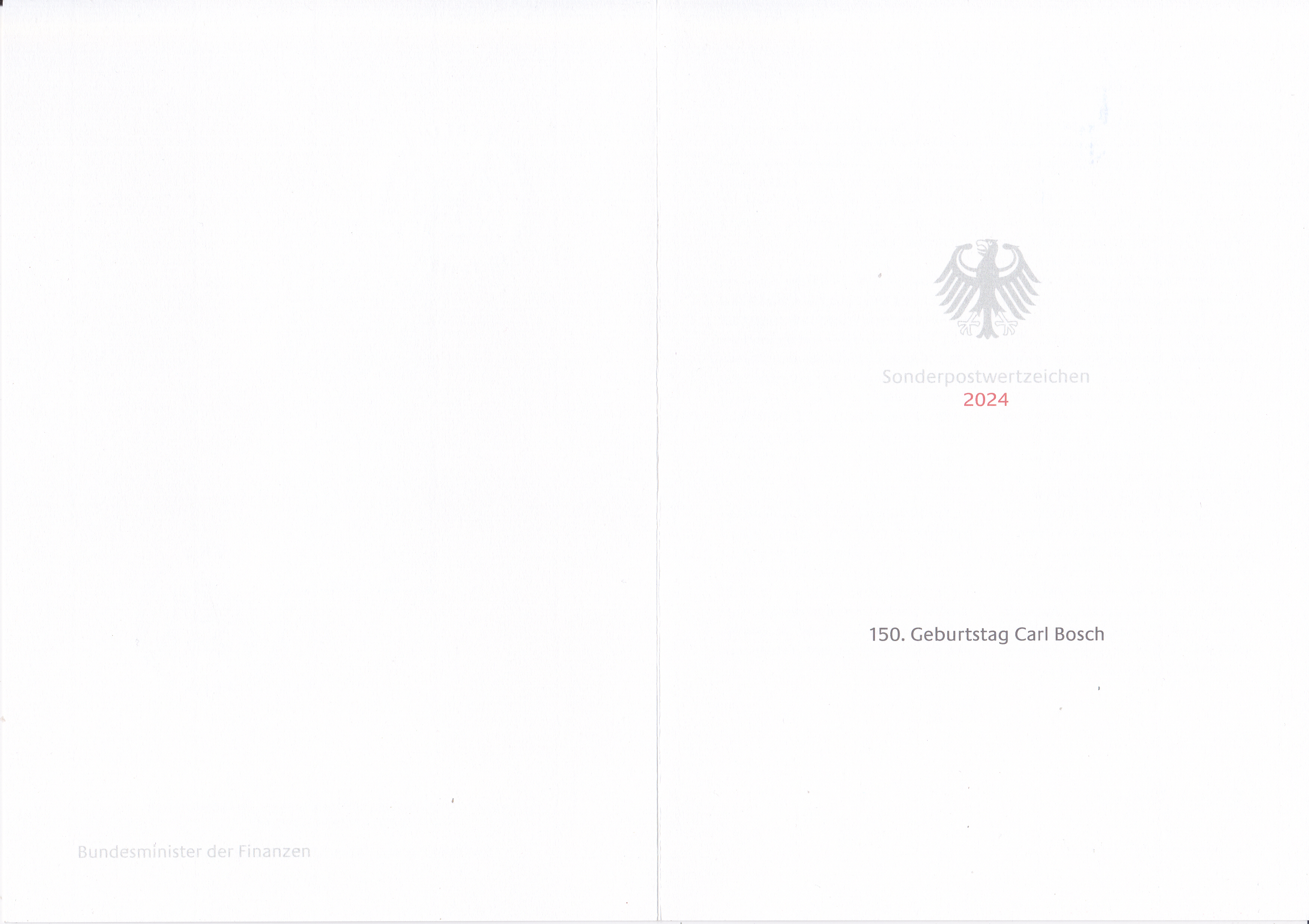 Ministerkarte des Bundesministers für Finanzen mit zwei Marken zum 150. Geburtstag von Carl Bosch (MiNr 3848) mit und den beiden Ersttagsonderstempel Bonn und Berlin.