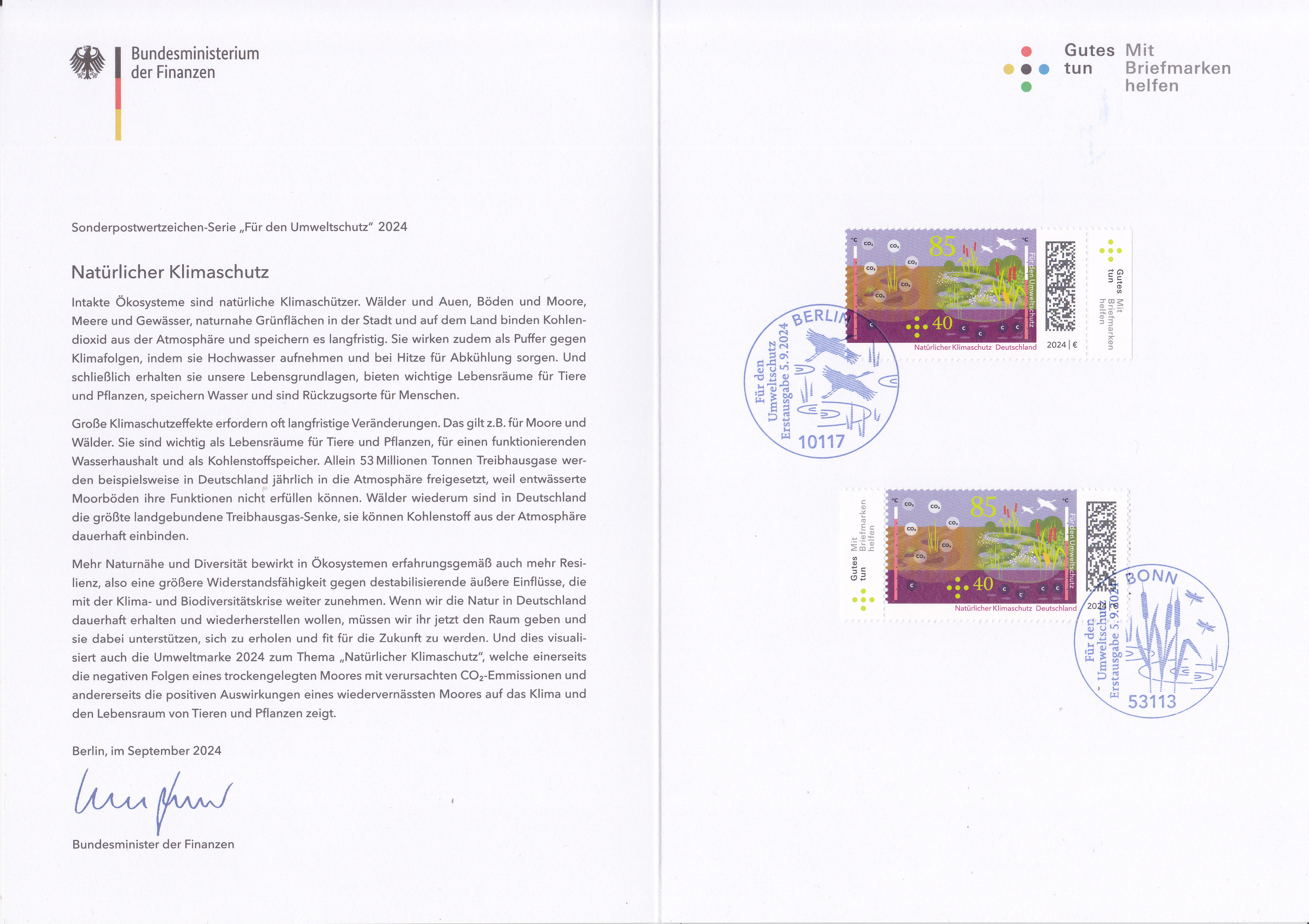 Ministerkarte des Bundesministers für Finanzen mit zwei Marken zum Umweltschutz "Natürlicher Klimaschutz" (MiNr 3850) und den beiden Ersttagsonderstempel Bonn und Berlin.