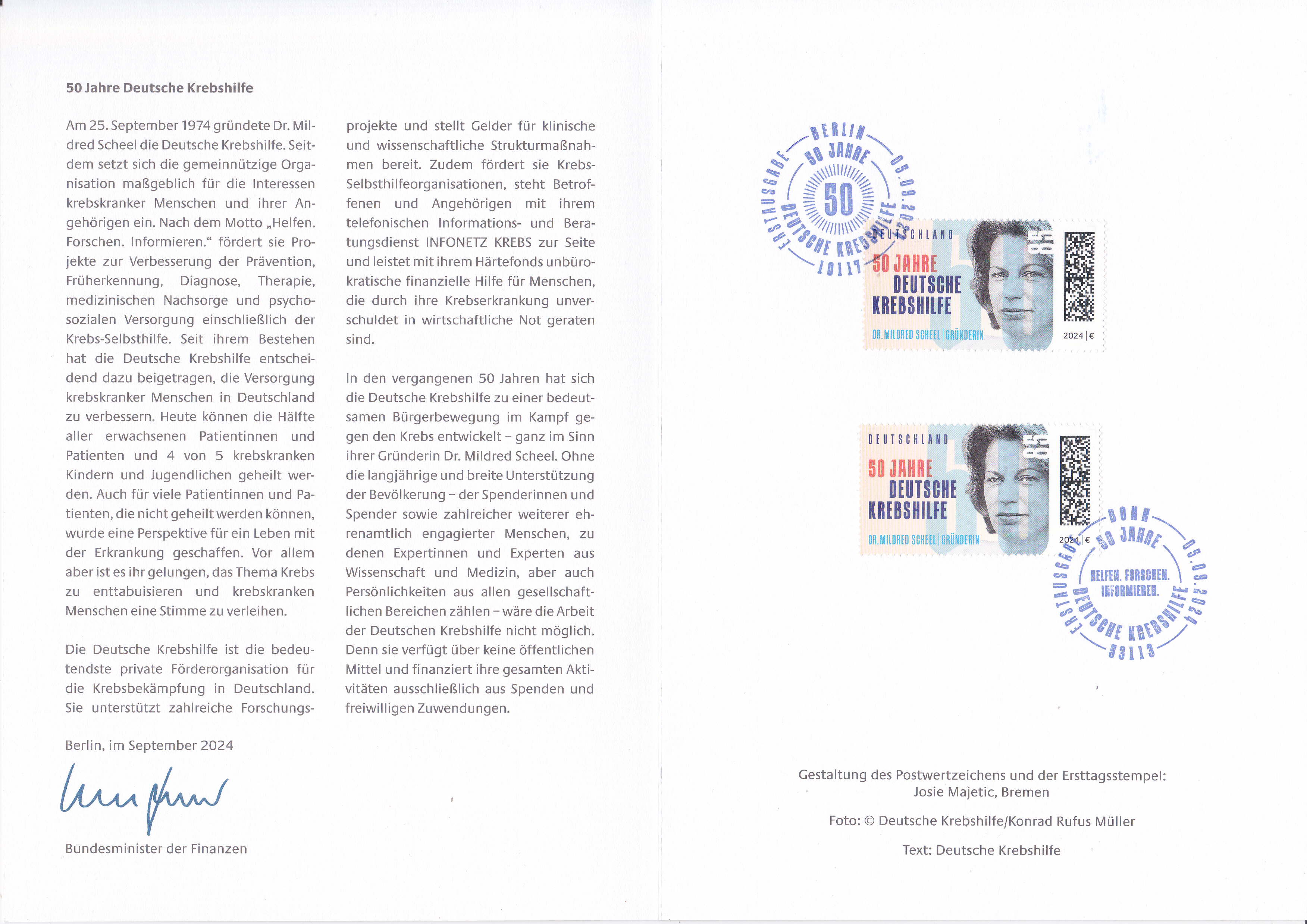 Ministerkarte des Bundesministers für Finanzen mit zwei Marken "50 Jahre Deutsche Krebshilfe" (MiNr 3853) und den beiden Ersttagsonderstempel Bonn und Berlin.