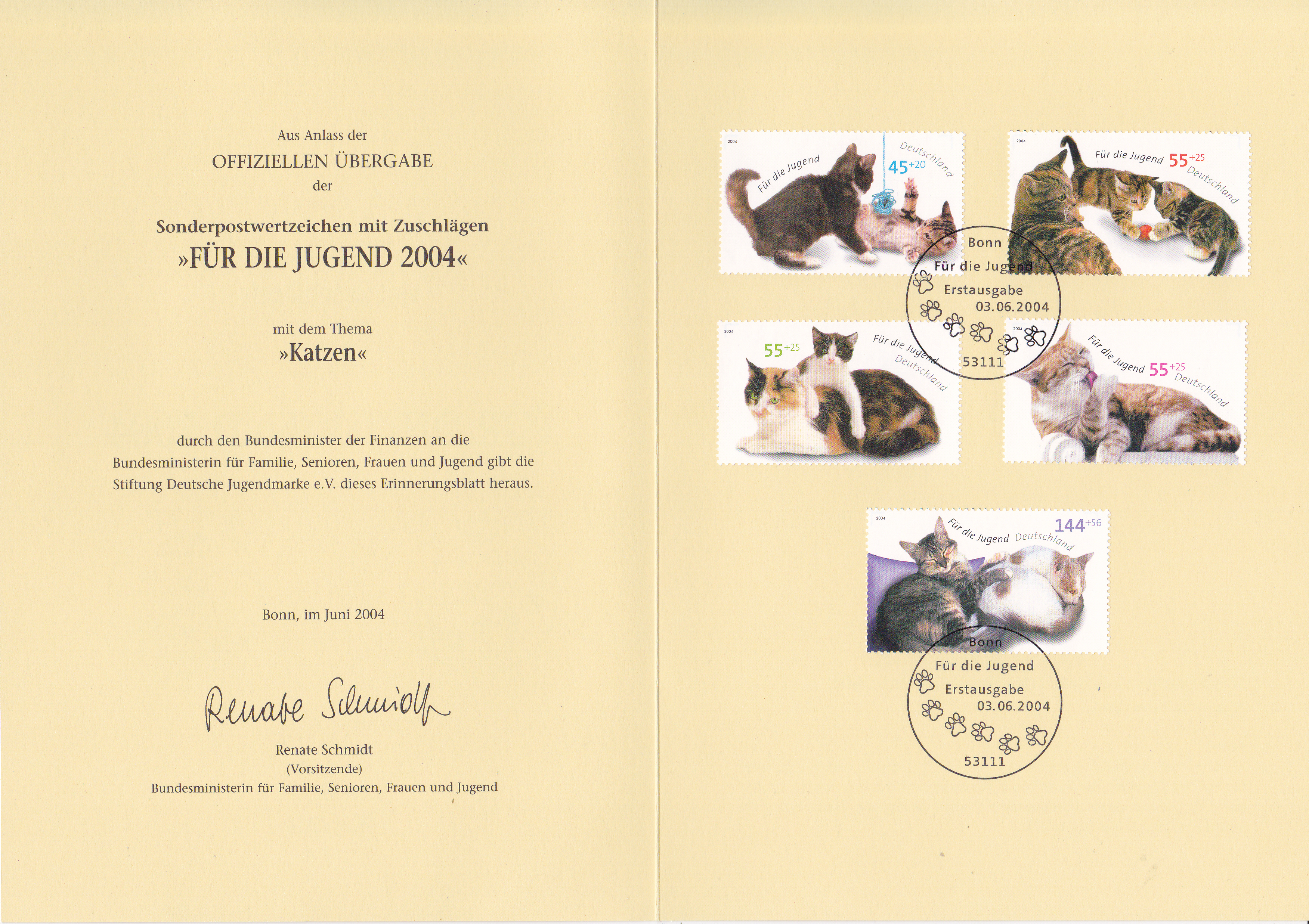 Diese Klappkarte (herausgegeben von der Stiftung Deutsche Jugendmarke e.V.) kann man auch hier unter dem Begriff "Ministerkarten" einordnen, da den Vorsitz bei dieser Stiftung immer der/die jeweilige Minister/in für Familie, Senioren, Frauen und Jugend hat, wie diese Klappkarte mit den Jugendmarken 2004 belegt.
