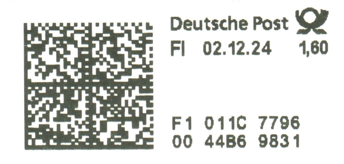 Dieser Brief der Portostufe 1,60 € wurde am 16.11.2024 mit zwei Postwertzeichen in Doppelnominale zu "€ 0,51" frankiert aufgegeben. Die zur Portostufe fehlenden "0,58" € wurden am Schalter bar bezahlt, was ein Label Deutsche Post FI dokumentiert: