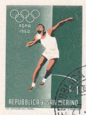 Die hier schon gezeigte Marke (MiNr 645) aus San Marino zu den Olympischen Spielen 1960 in Rom mit einem Kugelstoßer gibt es auch geschnitten in einer anderen Farbe (MiNr 667).