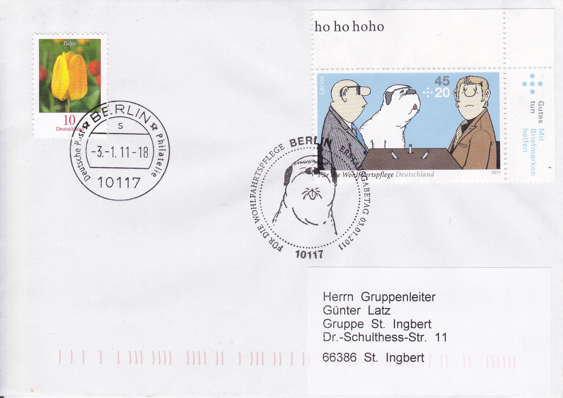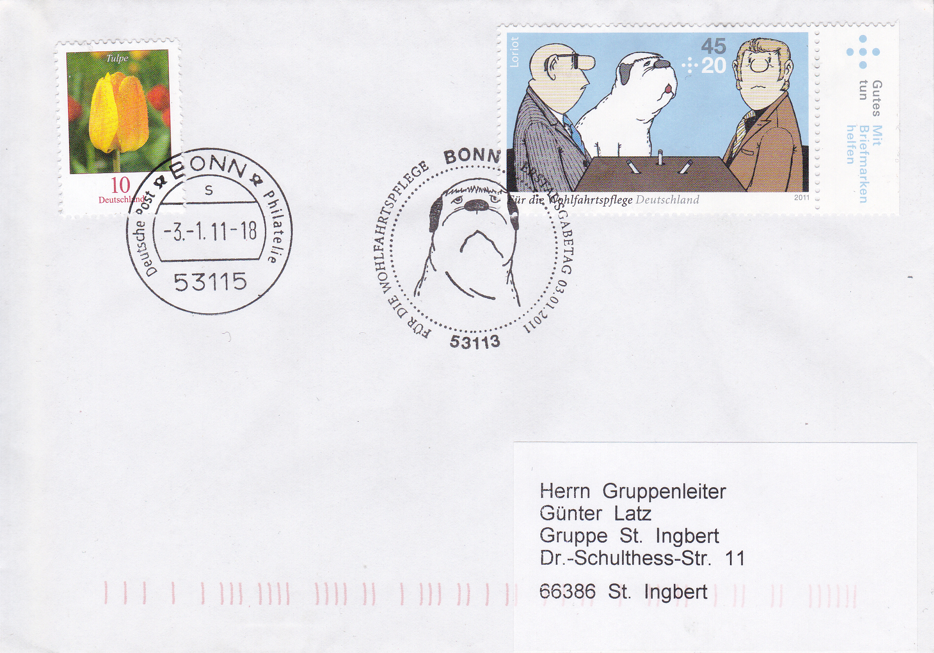 Brief mit der Marke zu 45+20 Cent (MiNr 2836) "Der sprechende Hund" und dem Ersttagsonderstempel Bonn. Die Zusatzfrankatur zu 10 Cent ist mit einem Tagesstempel entwertet.