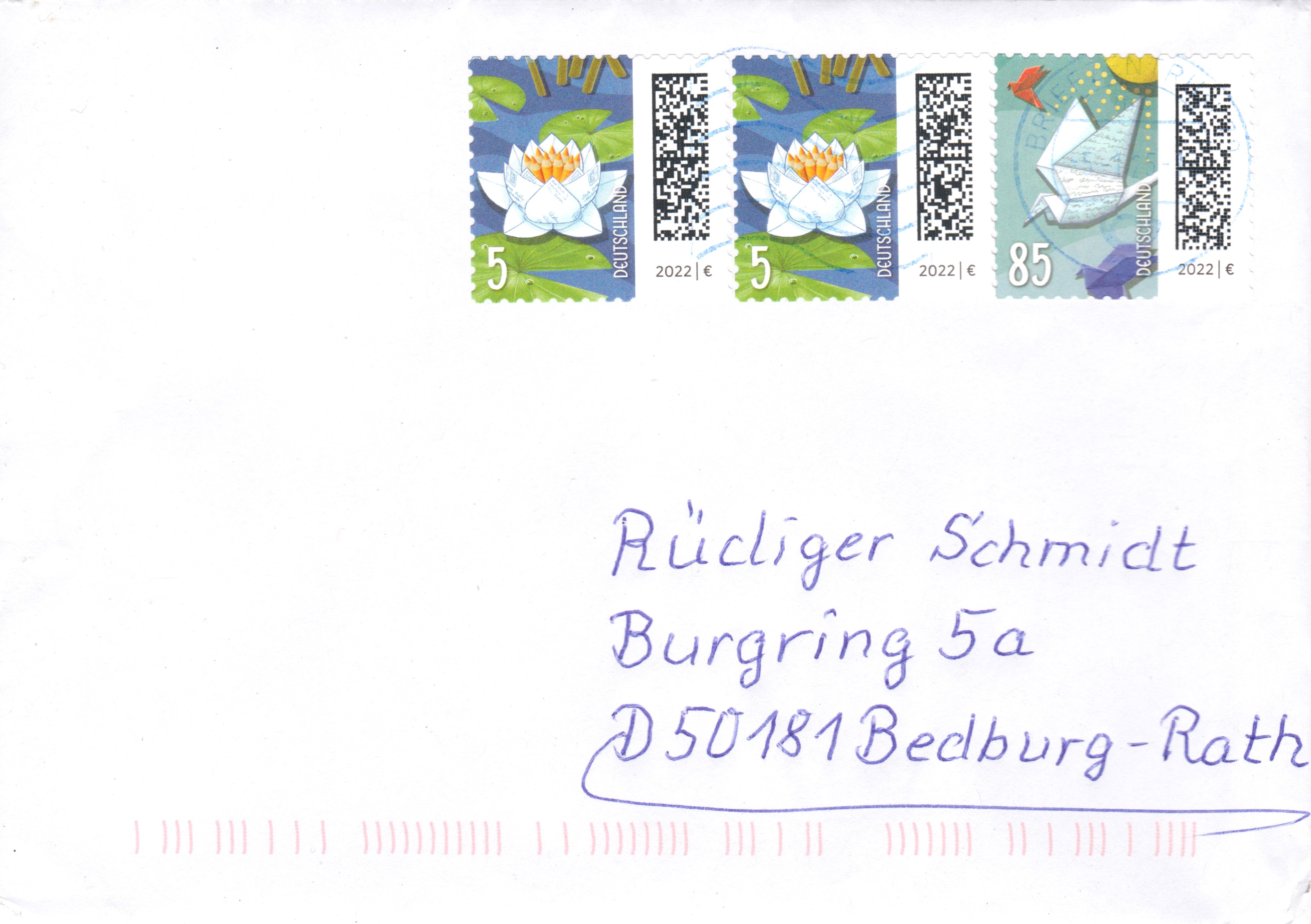 Brief als Einschreiben Einwurf vom 2.1.2025 mit einer selbstklebenden Marke zu 290 Cent aus der Serie "Welt der Briefe" (MiNr 3876) mit dem Erstverwendungsstempel und zwei Marken zu 20 Cent aus der Blumenserie (MiNr 2471Eo/Eu) mit einem Tagesstempel. Das Porto berechnet sich wie folgt Standardbrief 95 Cent, Zusatzleistung Einschreiben Einwurf 235 Cent ergibt zusammen 330 Cent.