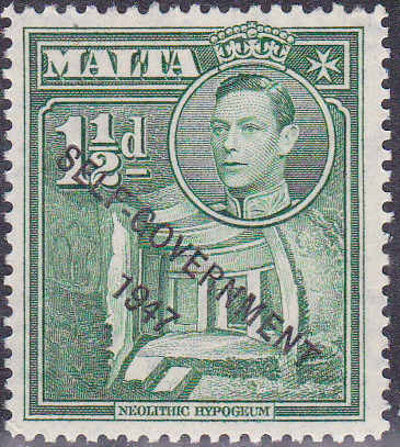 Aus dieser Serie zeige ich die Marke zu 3 Pence in blau mit dem Aufdruck "SELF-GOVERNMENT / 1947" (MiNr 205).