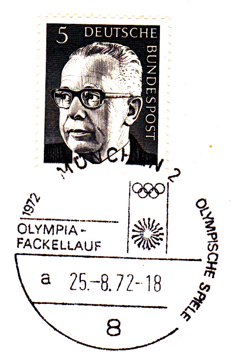 Am 25.8.1972 erreichte der Fackellauf den Olympiaort München, wie dieser Sonderstempel aus München vom 25.8.1972 Kennbuchstabe "a" ohne Uhrzeit beweist.