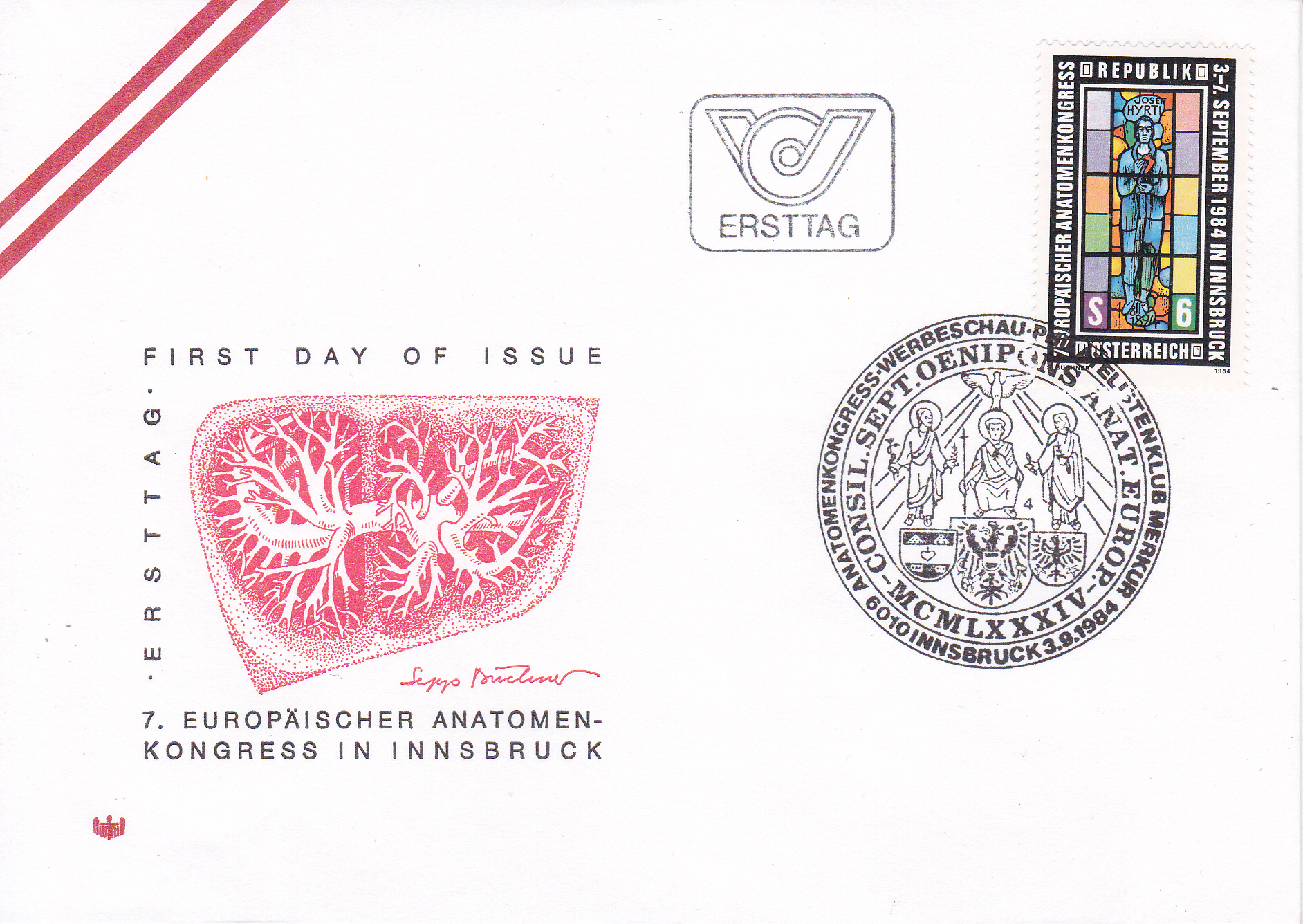 Aus Österreich kommt diese Marke (MiNr 1790) zum Europäischen Anatomenkongress in Innsbruck. Auf der Marke sehen wir Josef Hyrtl (1810-1894, Anatom) aus einem Glasfenster im Institut für Anatomie in Innsbruck von Joseph Widmoser.