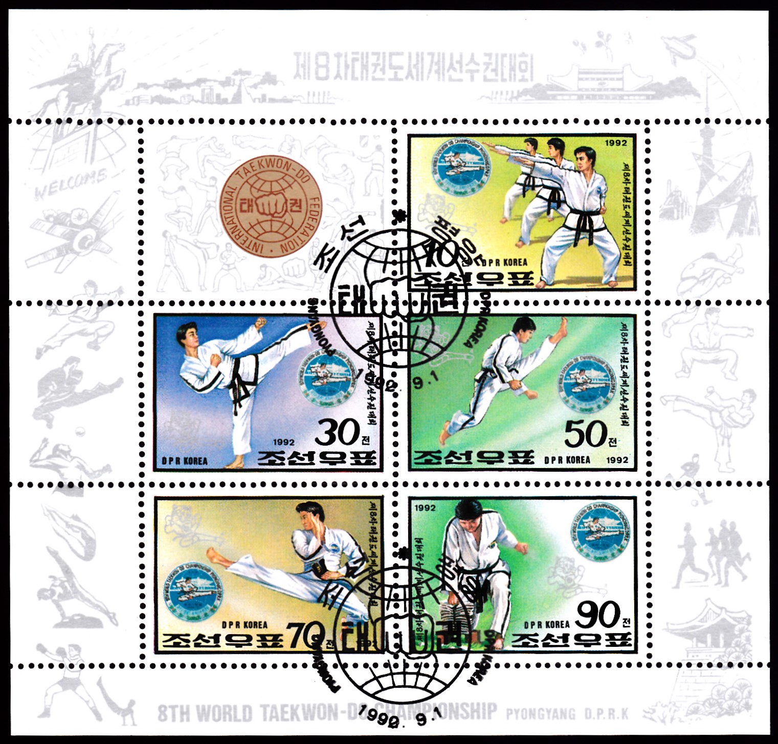 Zur Taekwondo-Weltmeisterschaft in Pjöngjang sind in Nord-Korea fünf Marken (MiNr 3344 - 3348) erschienen. Diese wurden auch zusammenhängend im Kleinbogen mit einem Zierfeld gedruckt. Hier zeige ich einen solchen Kleinbogen.