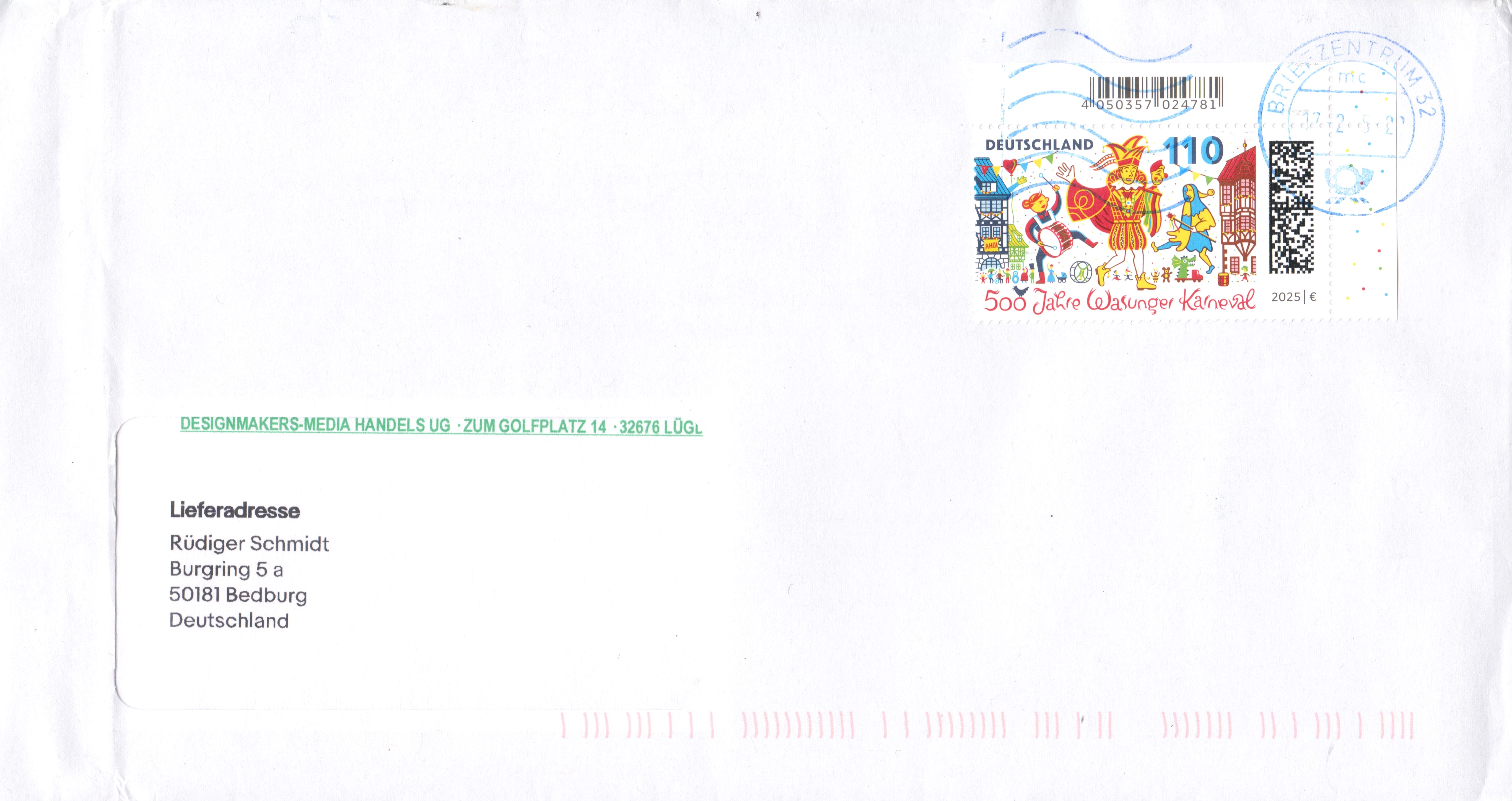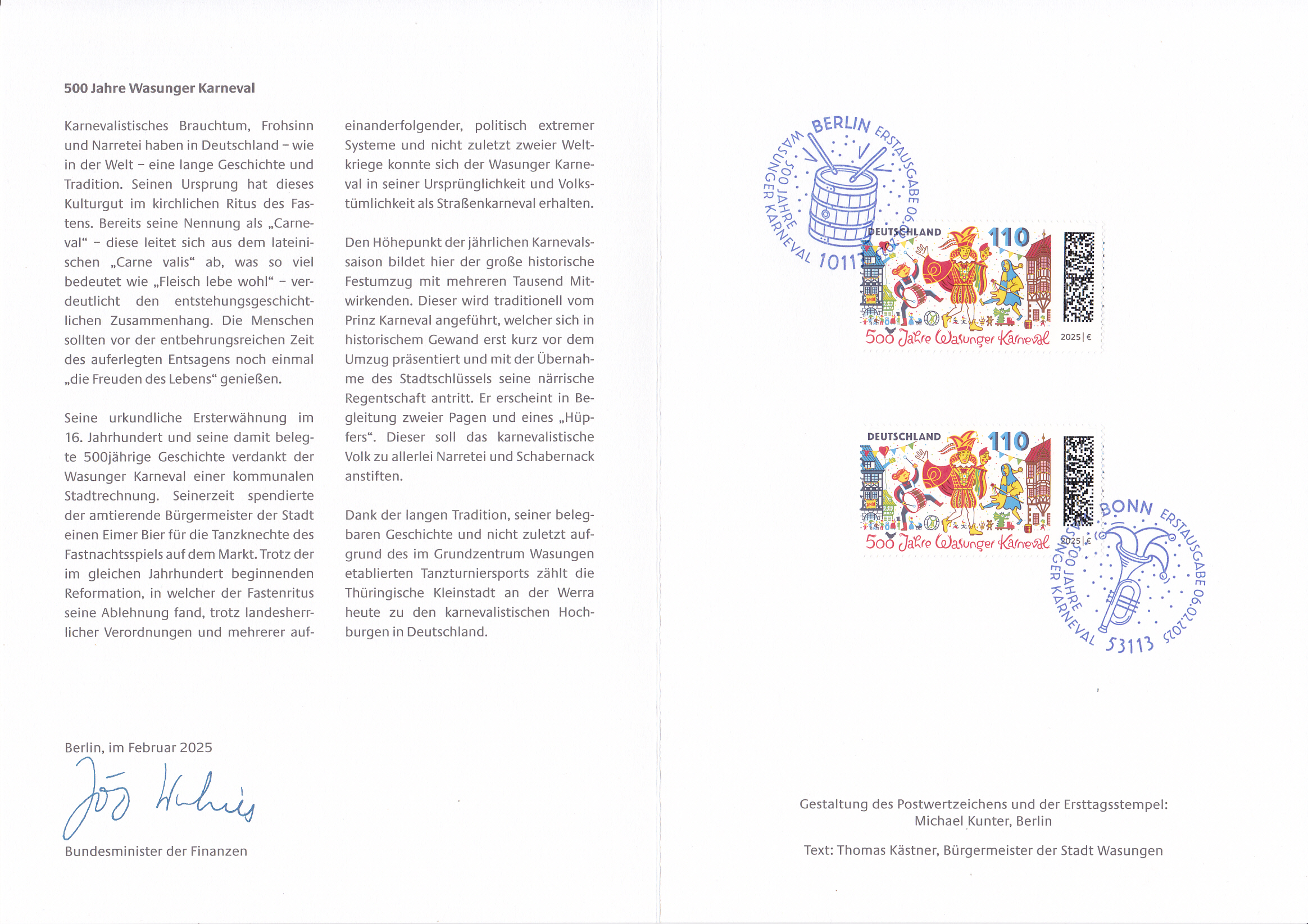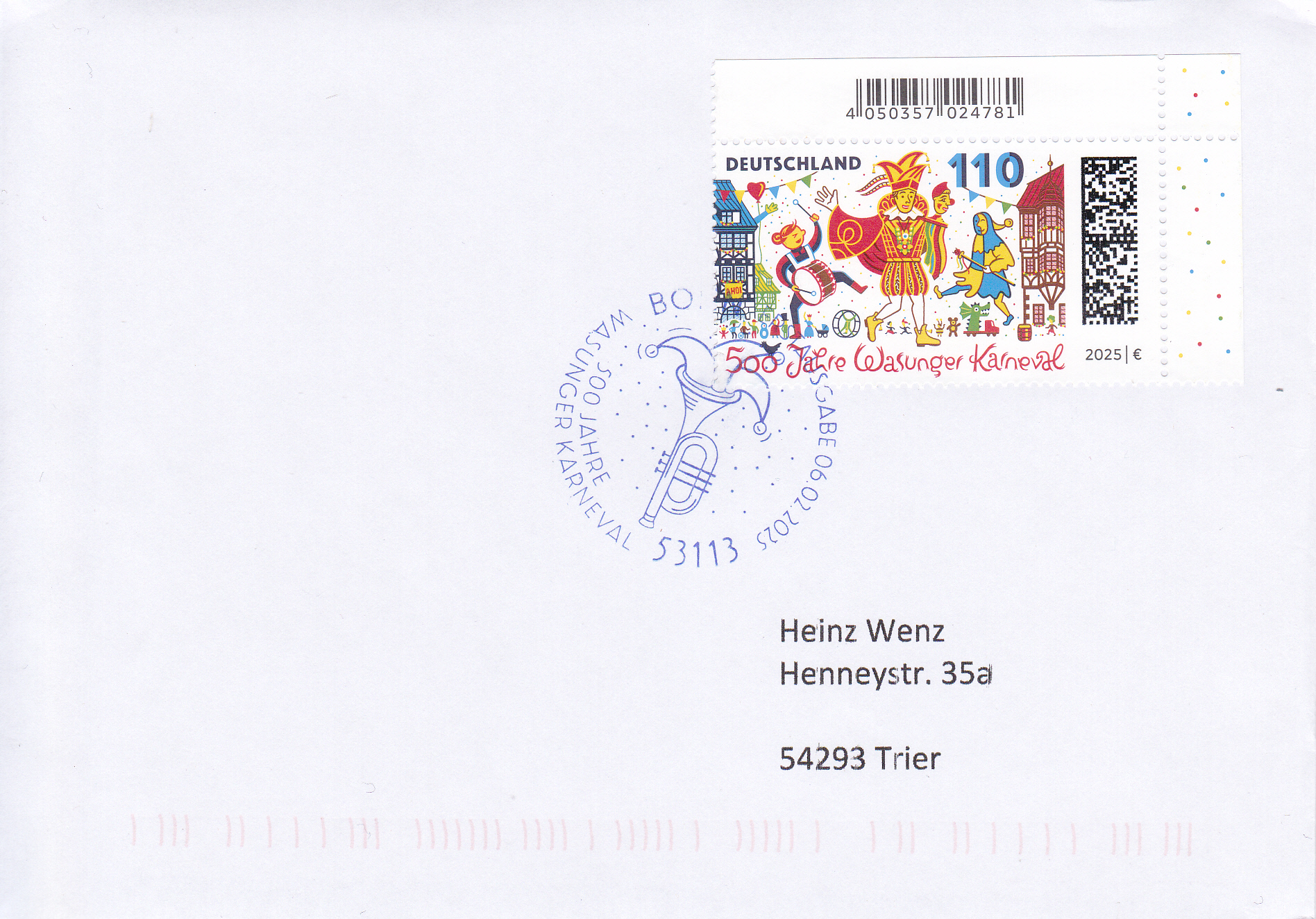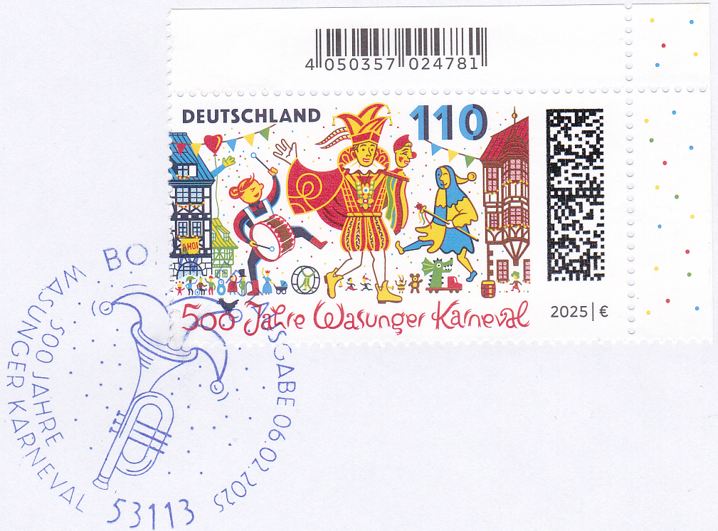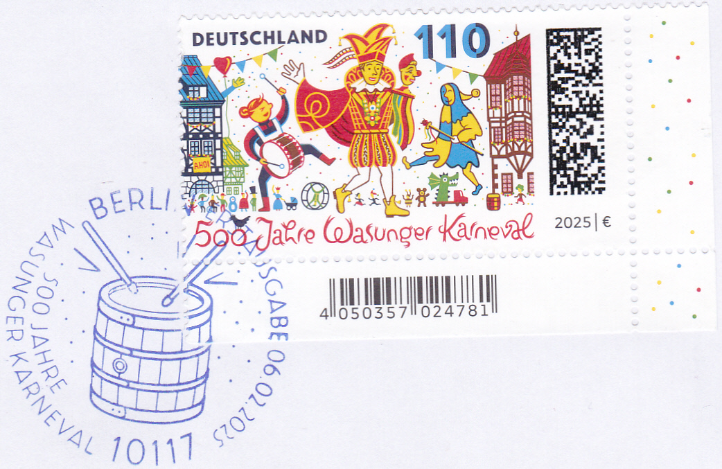 Auf dieser Marke (MiNr 3888) zum Thema "500 Jahre Wasunger Karneval" sehen wir eine Darstellung zum Wasunger Karnevalsumzug mit Trommlerin, Prinz und Narr "Höpfer" vor dem Rathaus und den Fachwerkhäusern am Markt.
