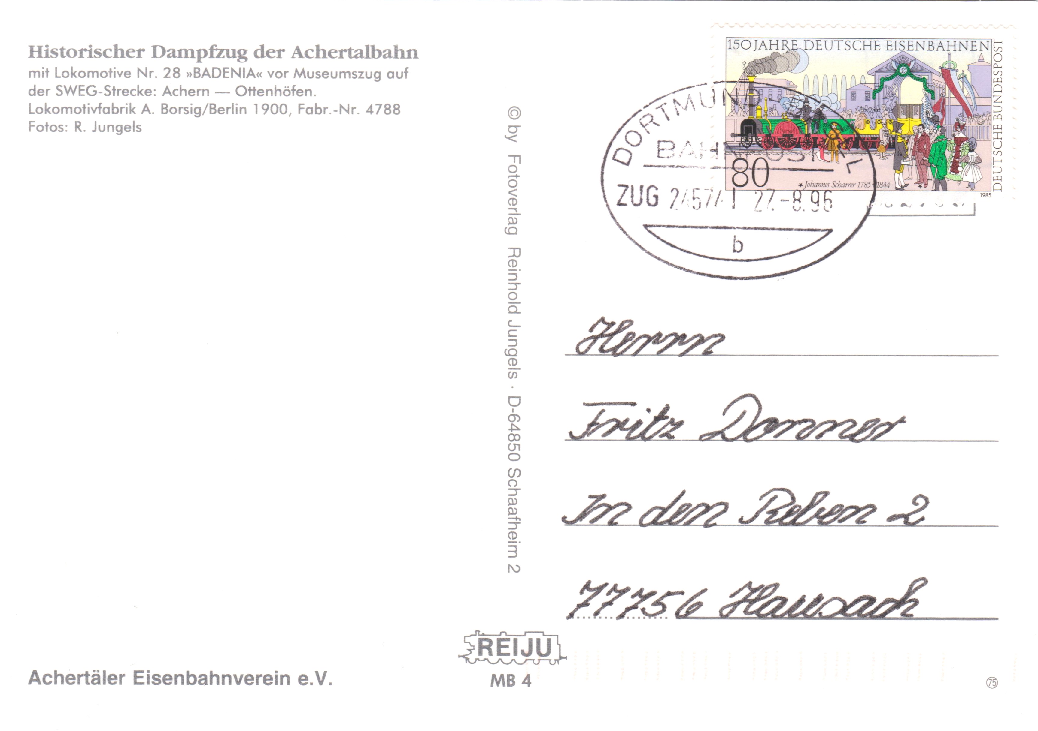 Diese Postkarten wurden am 27.08.1996 im ZUG 24574 DORTMUND - BASEL aufgegeben: