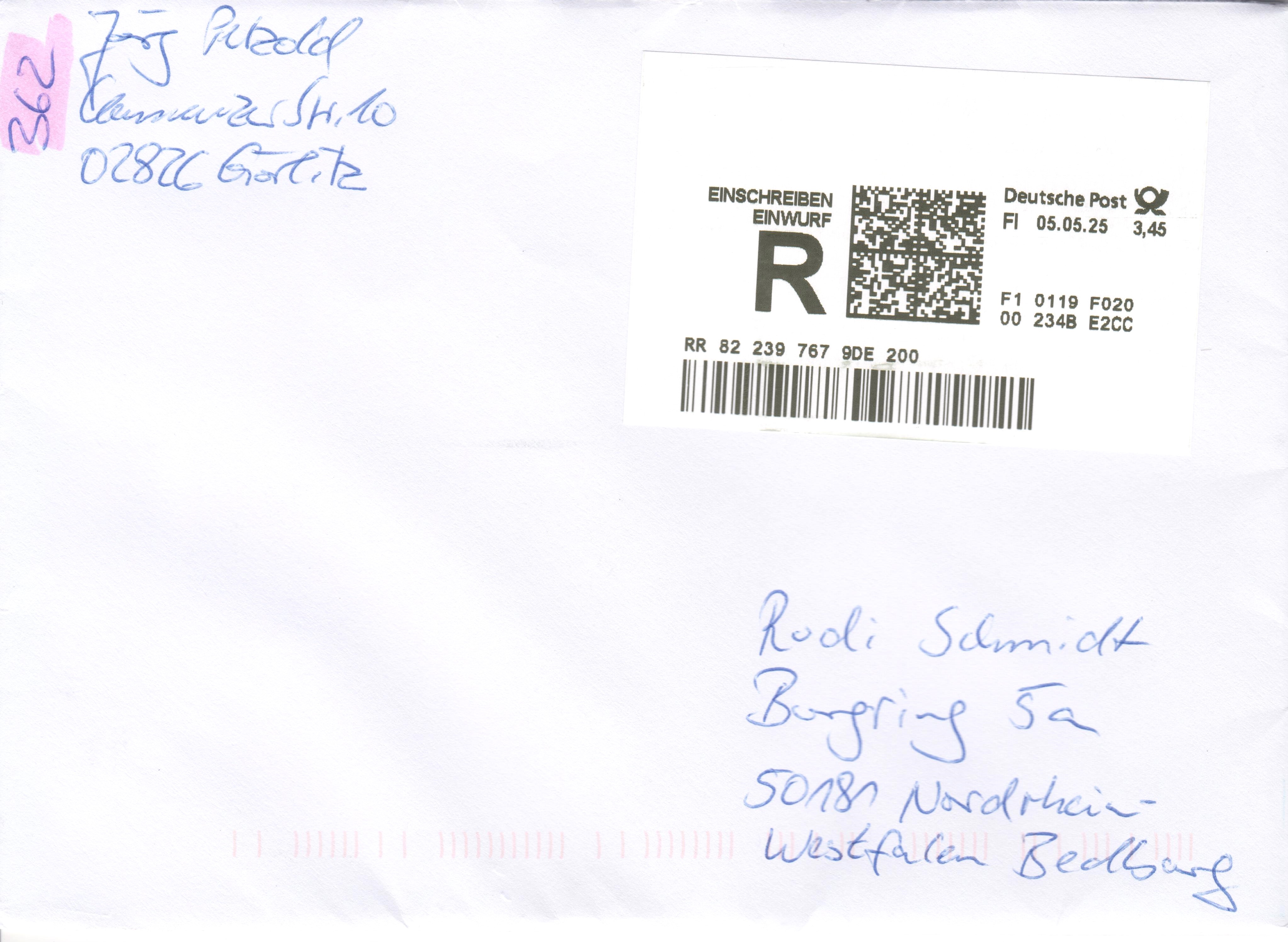 Dieser Brief per Einwurfeinschreiben der Portostufe 3,45 € wurde am 05.05.2025 in einer Postfiliale "Fl" aufgegeben: