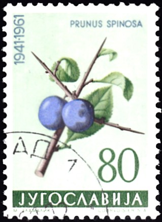 Schweden MiNr. 1222 aus der Freimarkenserie "Früchte" zeigt einen Zweig mit Früchten eines Schwarzdorn (Prunus spinosa):