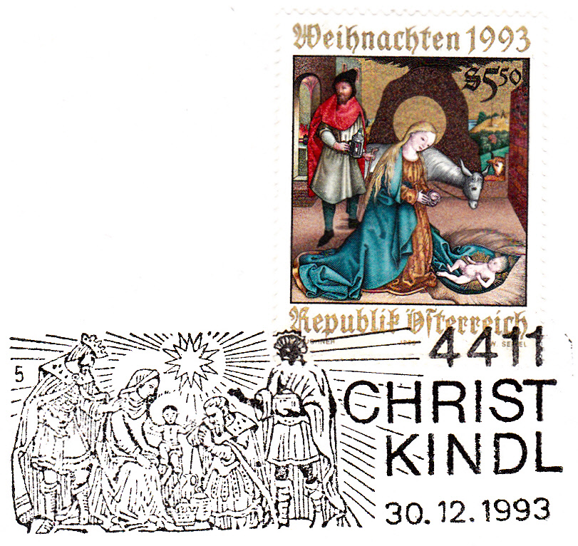 Im Sonderstempel von Christkindl vom 27.12.1993 (Laufzeit bis 6.1.1994) huldigen die drei Weisen aus dem Morgenlande dem Jususkind und bringen ihm ihre Gaben.