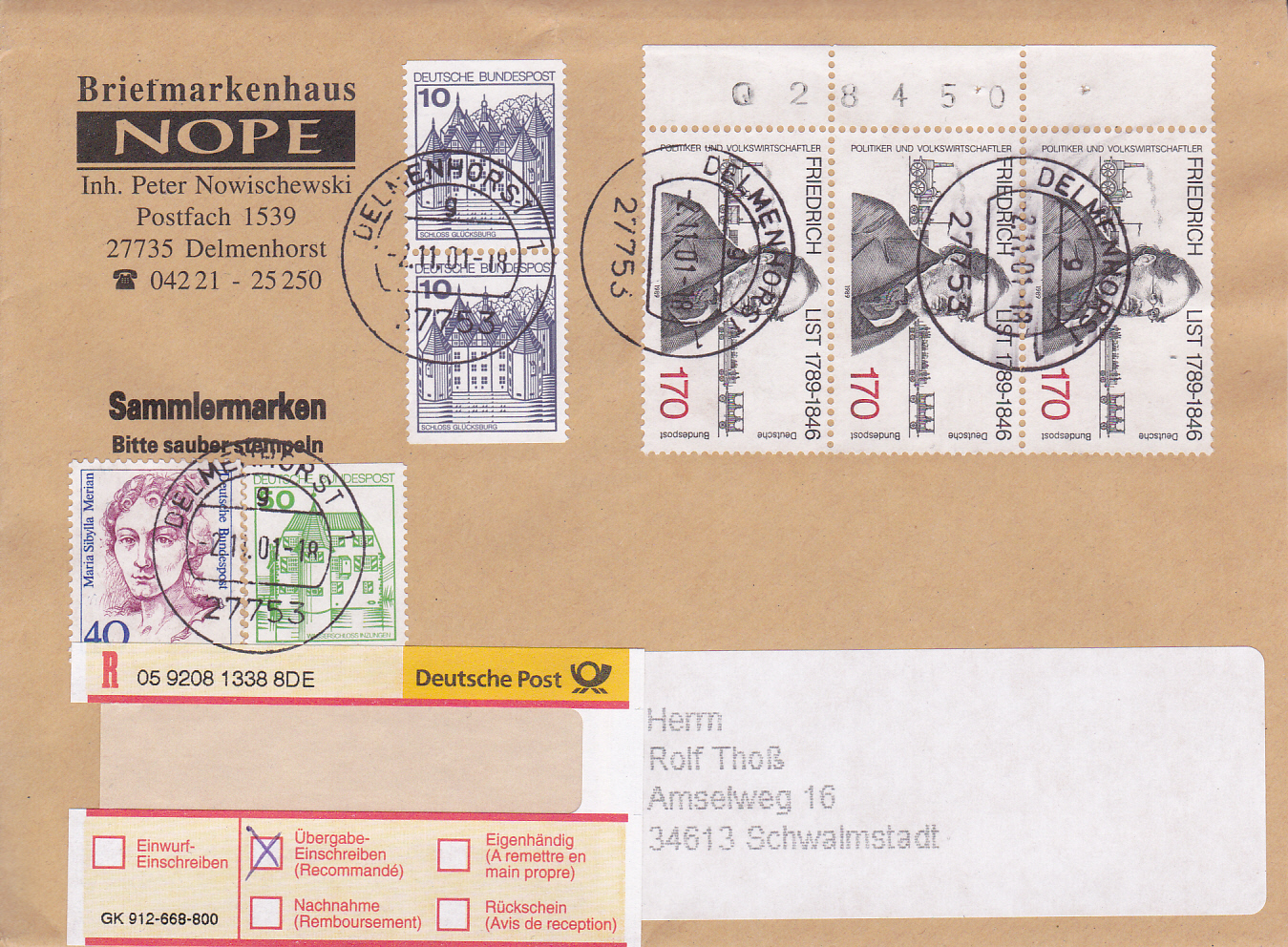 Brief vom 2.11.2001 21 bis 50 Gramm per Übergabeeinschreiben von Delmenhorst nach Schwalnstadt. Das Porto berechnet wie folgt: Brief 21 bis 50g 220Pf, Übergabeeinschreiben 400Pf, zusammen 620Pf. Der Brief wurde mit drei Marke zu je 170Pf (MiNr 1429), einer Marke zu 40Pf (MiNr 1331) aus der DS "Frauen", zwei Marken zu 10Pf (MiNr 913 C/D) und einer Marke zu 50Pf (MiNr 1038 C) aus der DS "Burgen und Schlösser) frankiert.