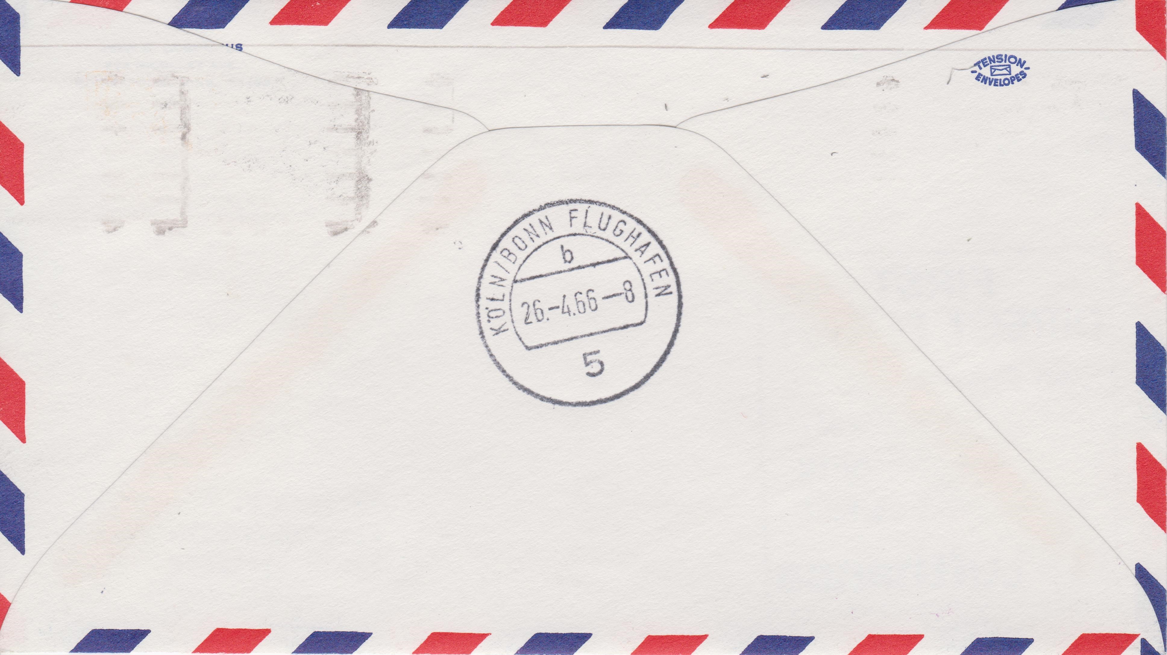 Dieser Beleg dokumentiert den ersten Lufthansa-Direktflug LH 463 am 25.04.1966 auf der Route SAN FRANCISCO - MONTREAL - COLOGNE: