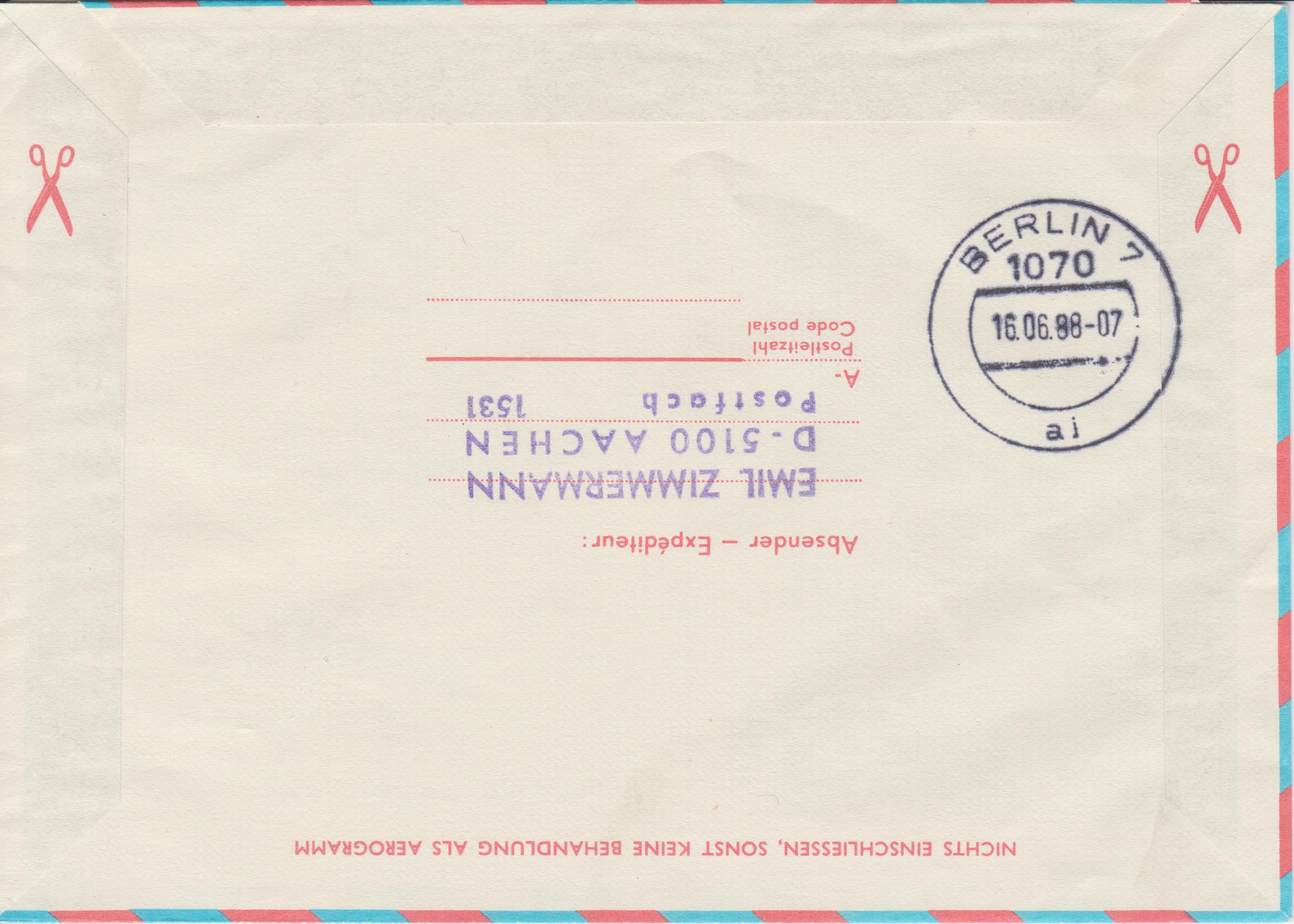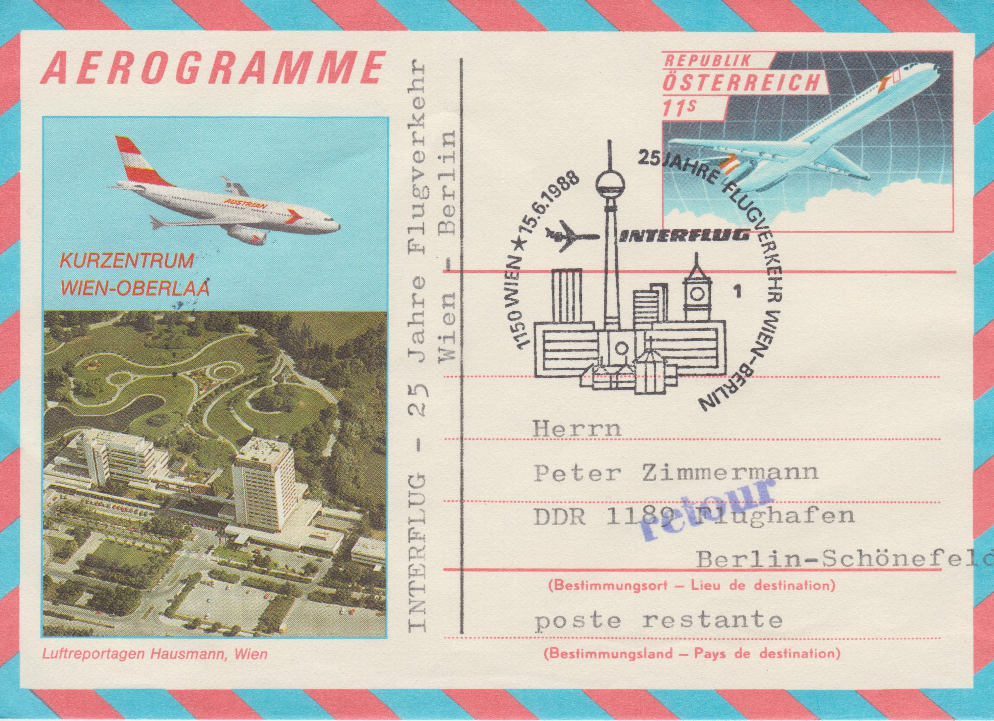 Diesers AEROGRAMM dokumentiert mit Sonderstempel 1150 WIEN vom 15.06.1988 das Jubiläum 25 JAHRE FLUGVERKEHR WIEN-BERLIN: