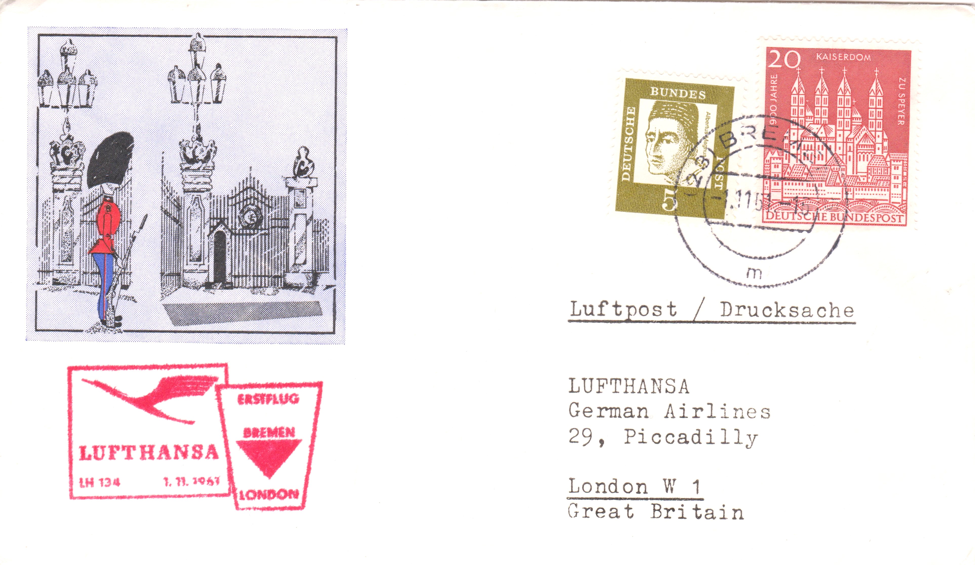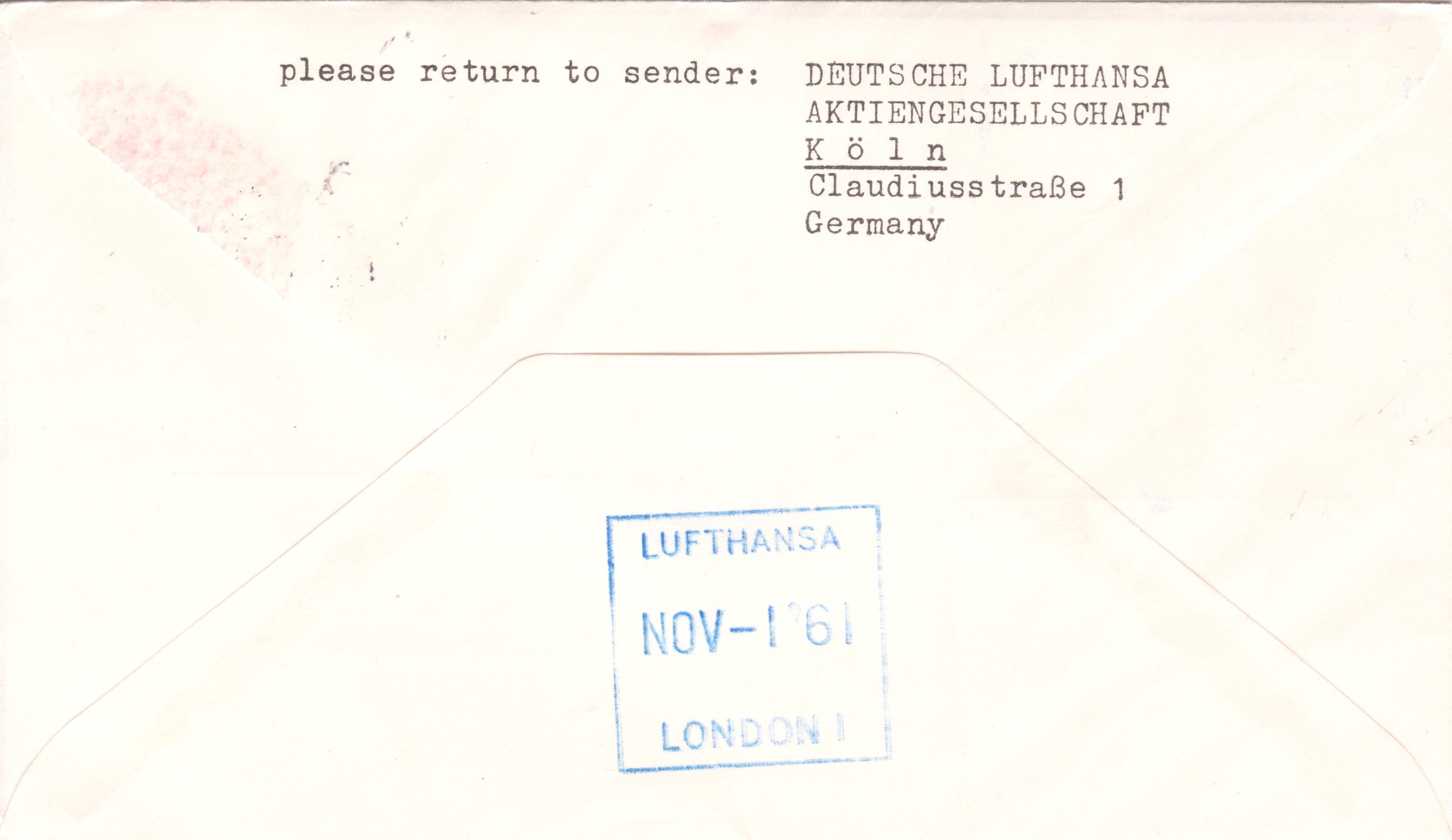 Flugbestätigungsstemel der LUFTHANSA zum ERSTFLUG LH 134 BREMEN - LONDON am 01.11.1961: