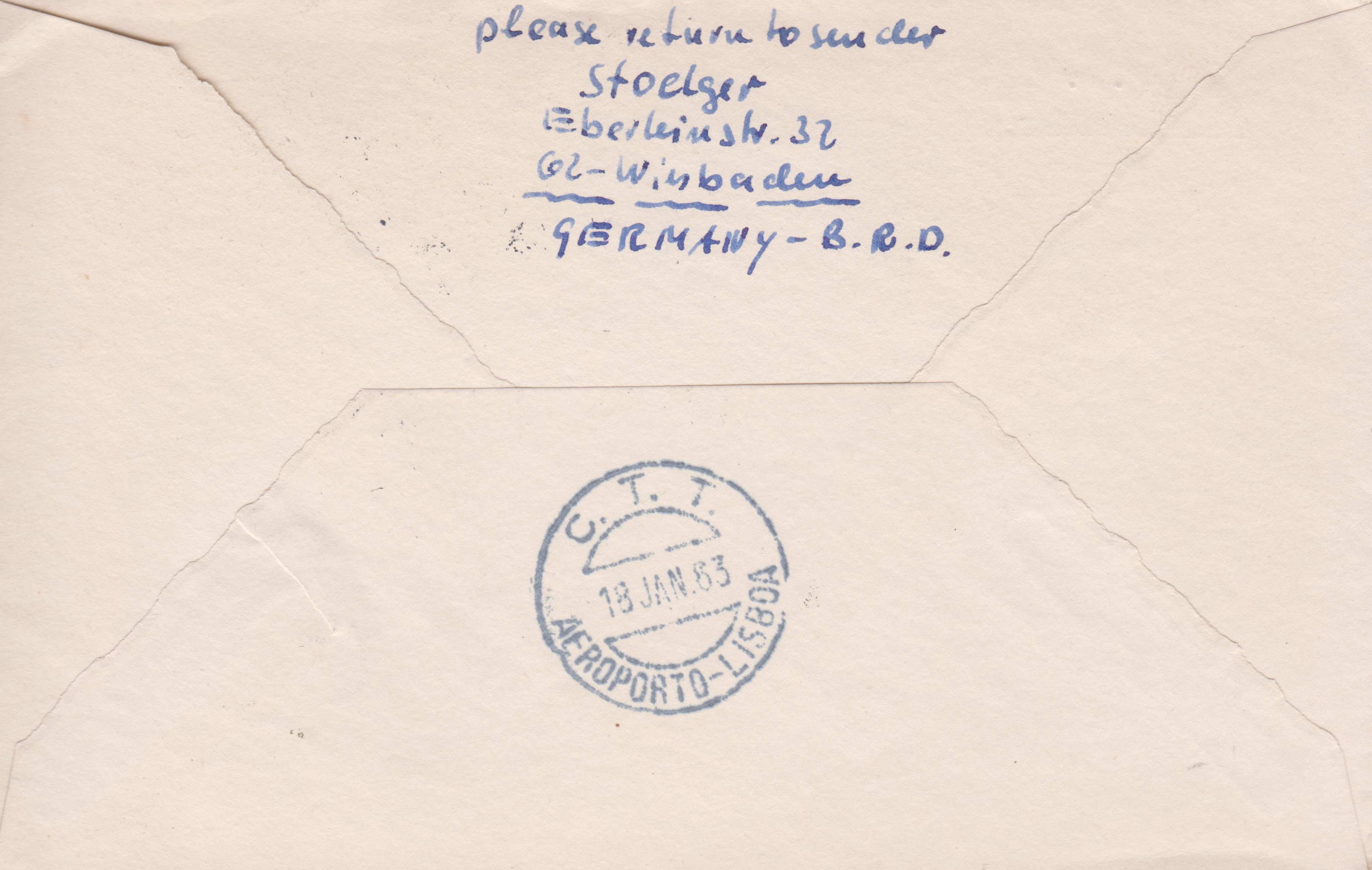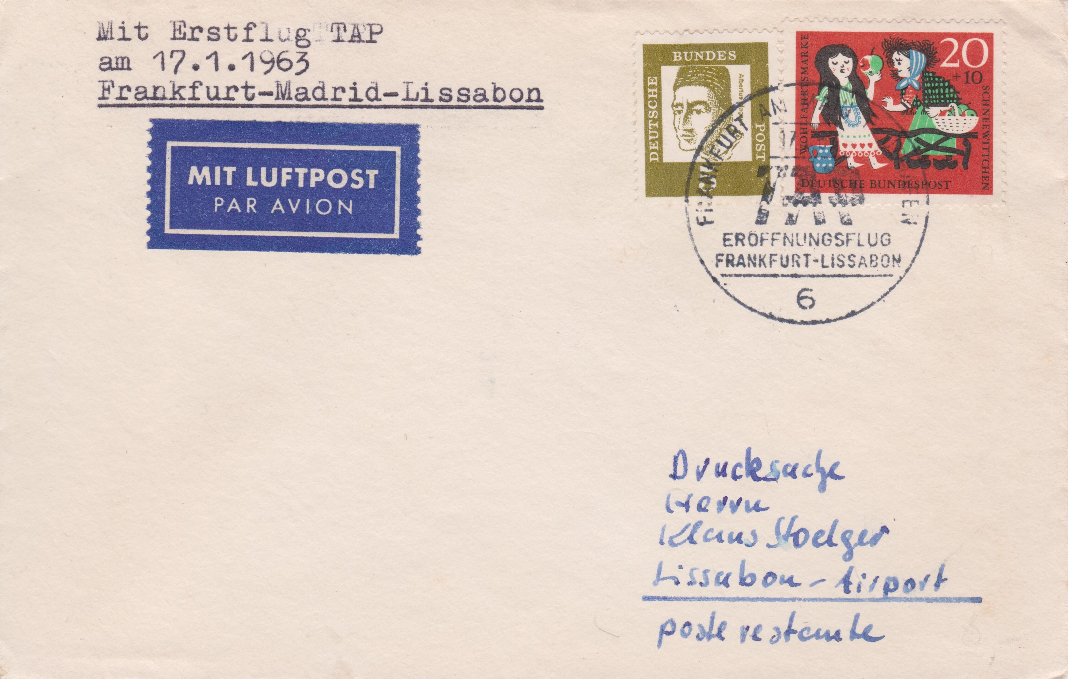 Dieser Beleg dokumentiert per Sonderstempel den Erstflug der TAP von Frankfurt über Madrid nach Lissabon am 17.01.1963: