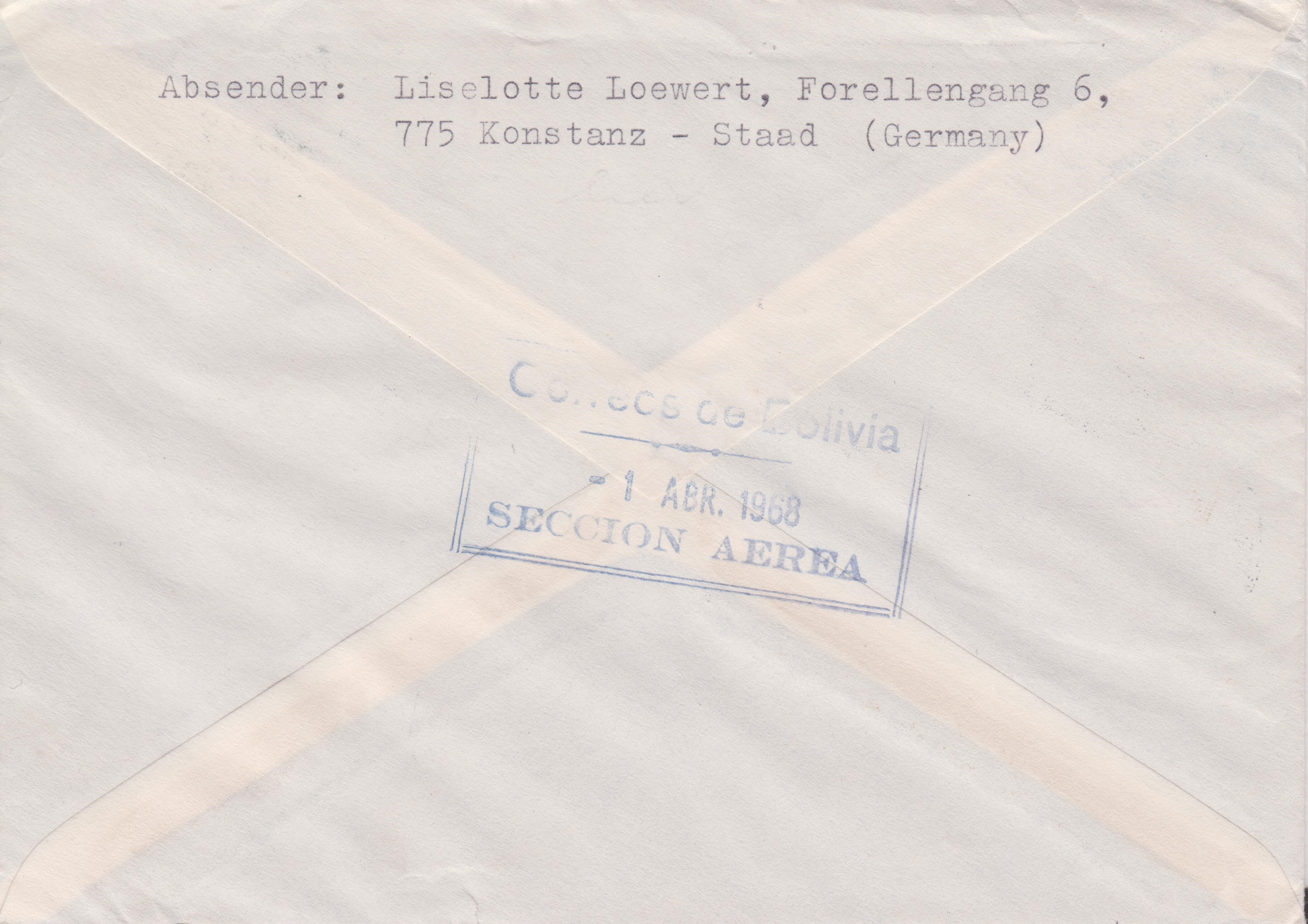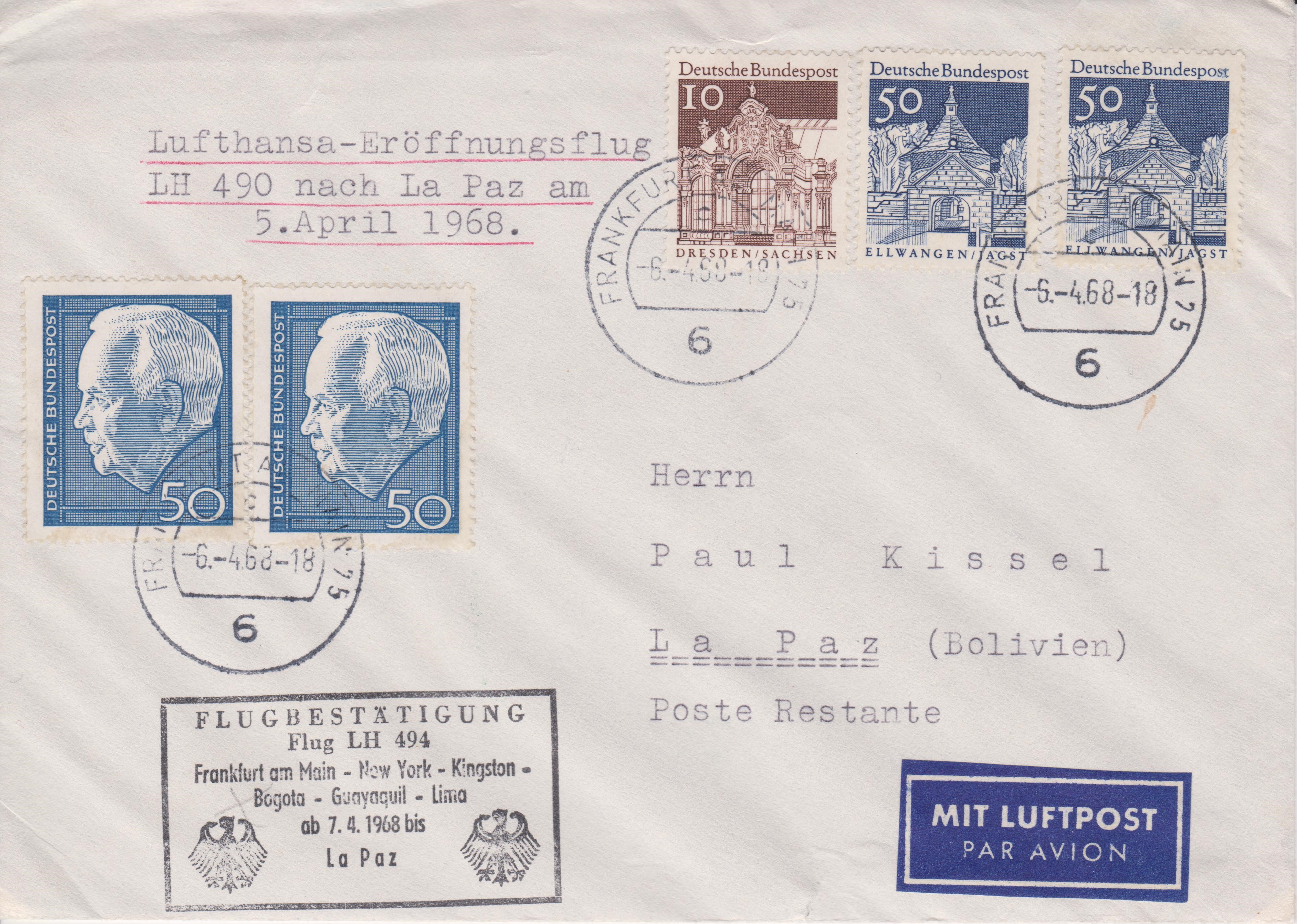 Dieser Beleg dokumentiert den Lufthansa-Eröffnungsflug am 07.04.1968 von FRANKFURT nach LA PAZ in Bolivien: