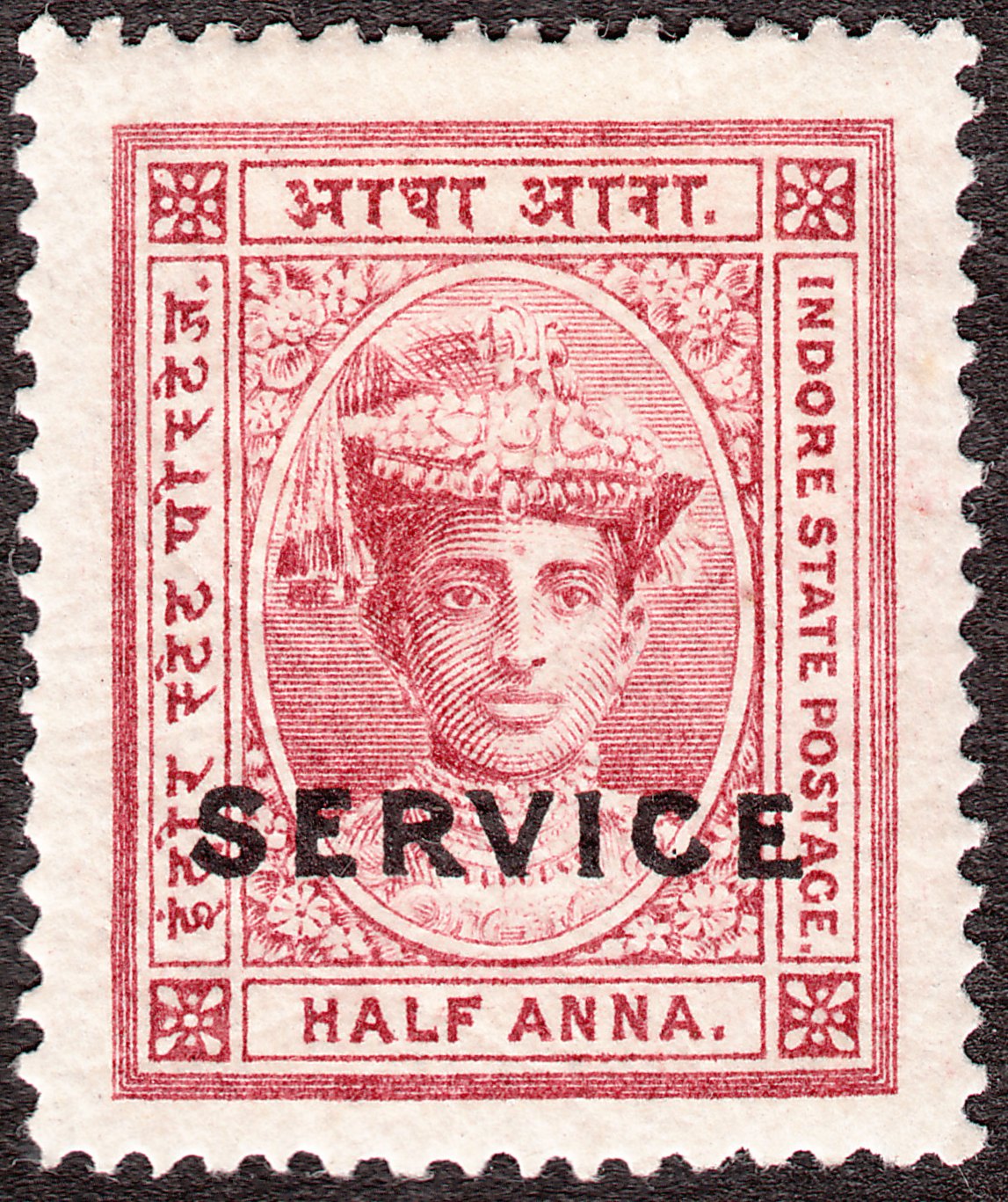 Die Freimarke Indore MiNr. 8 wurde mit schwarzem Aufdruck "SERVICE" versehen als Indore Dienstmarke MiNr. D 2 ausgegeben: