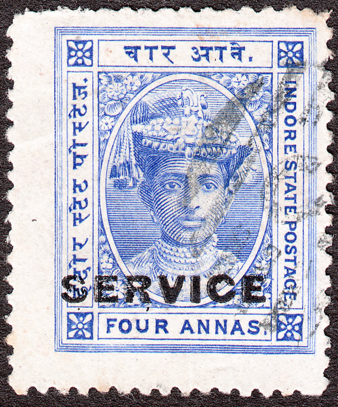 Die Freimarke Indore MiNr. 12 wurde mit schwarzem Aufdruck "SERVICE" versehen als Indore Dienstmarke MiNr. D 6 ausgegeben: