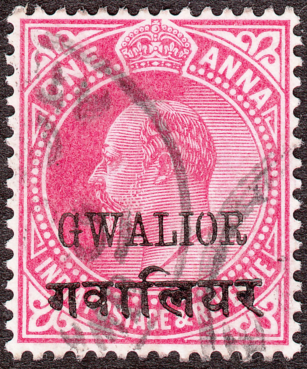 Die Freimarke Indien MiNr. 71 mit der Inschrift "INDIA POSTAGE & REVENUE" wurde 1907 in Gwalior mit einem zweizeiligen schwarzen Aufdruck "GWALIOR" in Englisch sowie in der Landessprache Devanagari versehen: