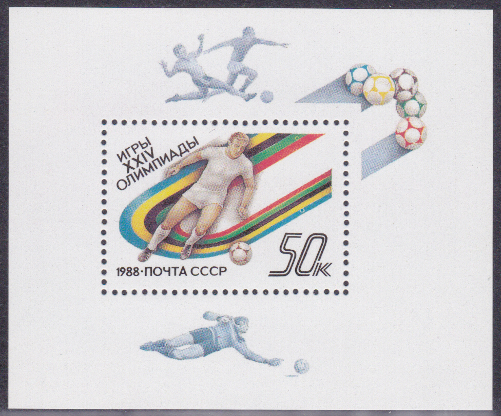 Eine Blockausgabe der Sowjetunion (MiNr Block 202 mit Marke MiNr 5845) vervollständigt die Ausgabe zu den Sommerspielen 1988. Auf der Marke ist ein Fußballspieler zu sehen.