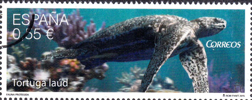 Aus einer Ausgabe "Geschützte Tierarten" aus Spanien kommt diese Marke (MiNr 4993) mit einer Lederschildkröte (Dermochelys coriacea). Bei der gezeigten Marke handelt es sich um eine Mustermarke.