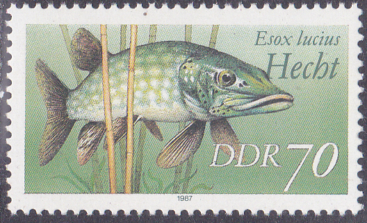 Die letzte Marke der Serie aus der DDR (MiNr 3100) bildet einen Hecht (Esox lucius) ab.