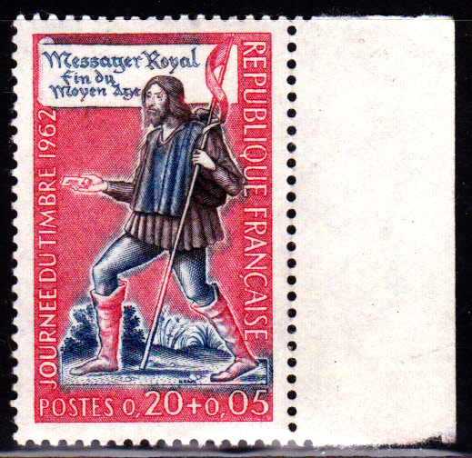 AM 17.3.1962 gab es in Frankreich diese Zuschlagsmarke zum Tag der Briefmarke 1962 (MiNr 1385) mit der Abbildung eines Königlichen Postboten (14.-16. Jh.).