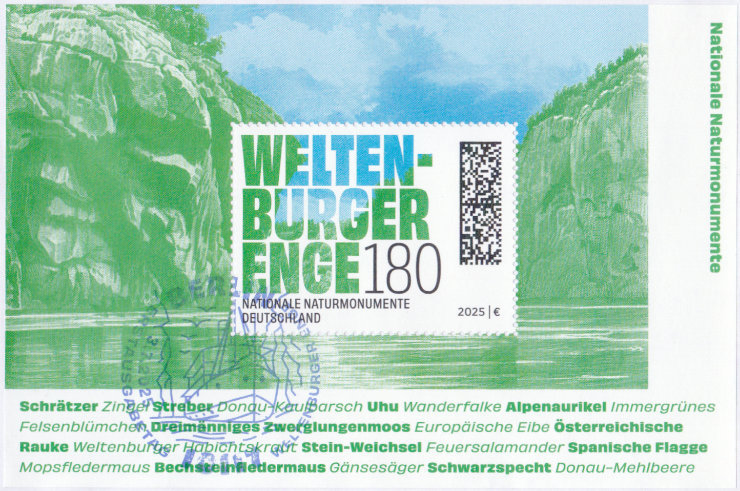 Diesr Blockausgabe (MiNr Block 95 mit Marke MiNr 3915) zeigt die Kalksteinfelsen "Lange Wand" und "Stille Wand" des Donaudurchbruchs "Weltenburger Enge" nach einem Stahlstich in Eduard Dullers "Die malerischen und romantischen Donauländer" (1840). Am unteren Blockrand sind Angaben zu Flora und Fauna aus dieser Landschaft nachzulesen.
