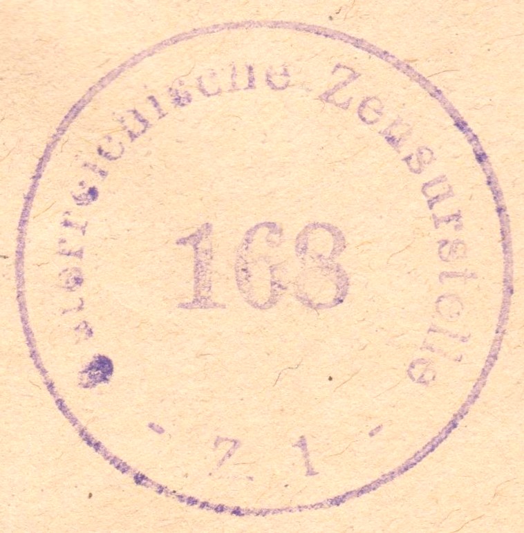 Anschließend durchlief der Beleg die sowjetische Prüfstelle in Wien = "Österreichische Zensurstelle Z. 1", wo ein Prüferstempel "168" abgeschlagen wurde: