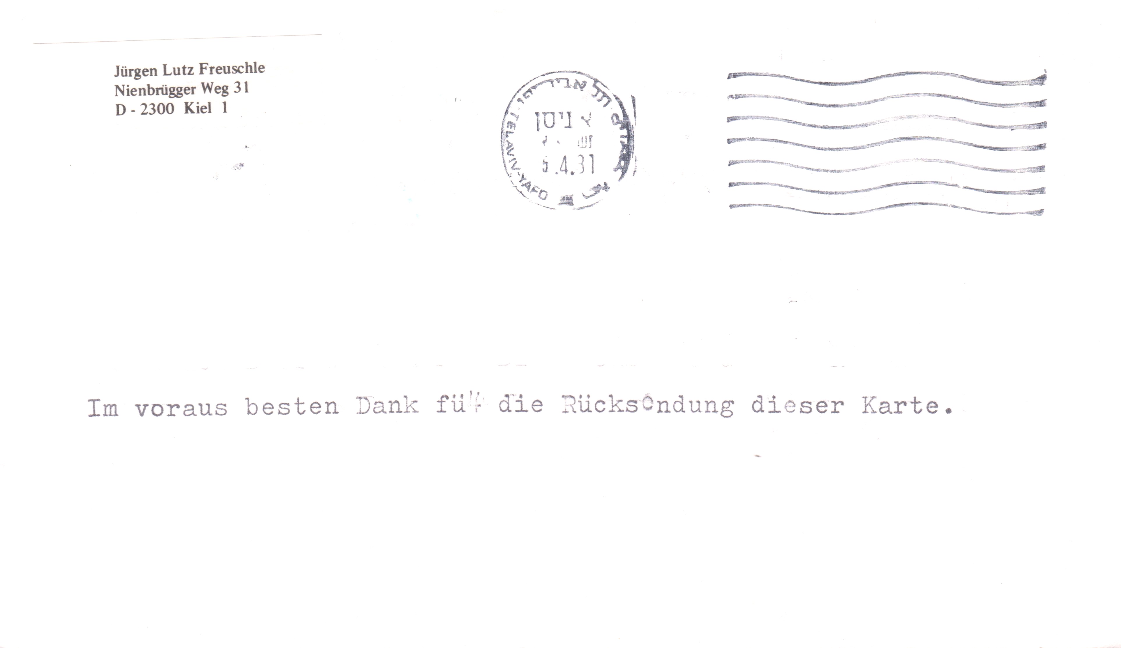 Diese Postkarte dokumentiert am 04.04.1981 den Erstflug einer BOEING 727 der Lufthansa von Düsseldorf nach Tel Aviv - Israel:
