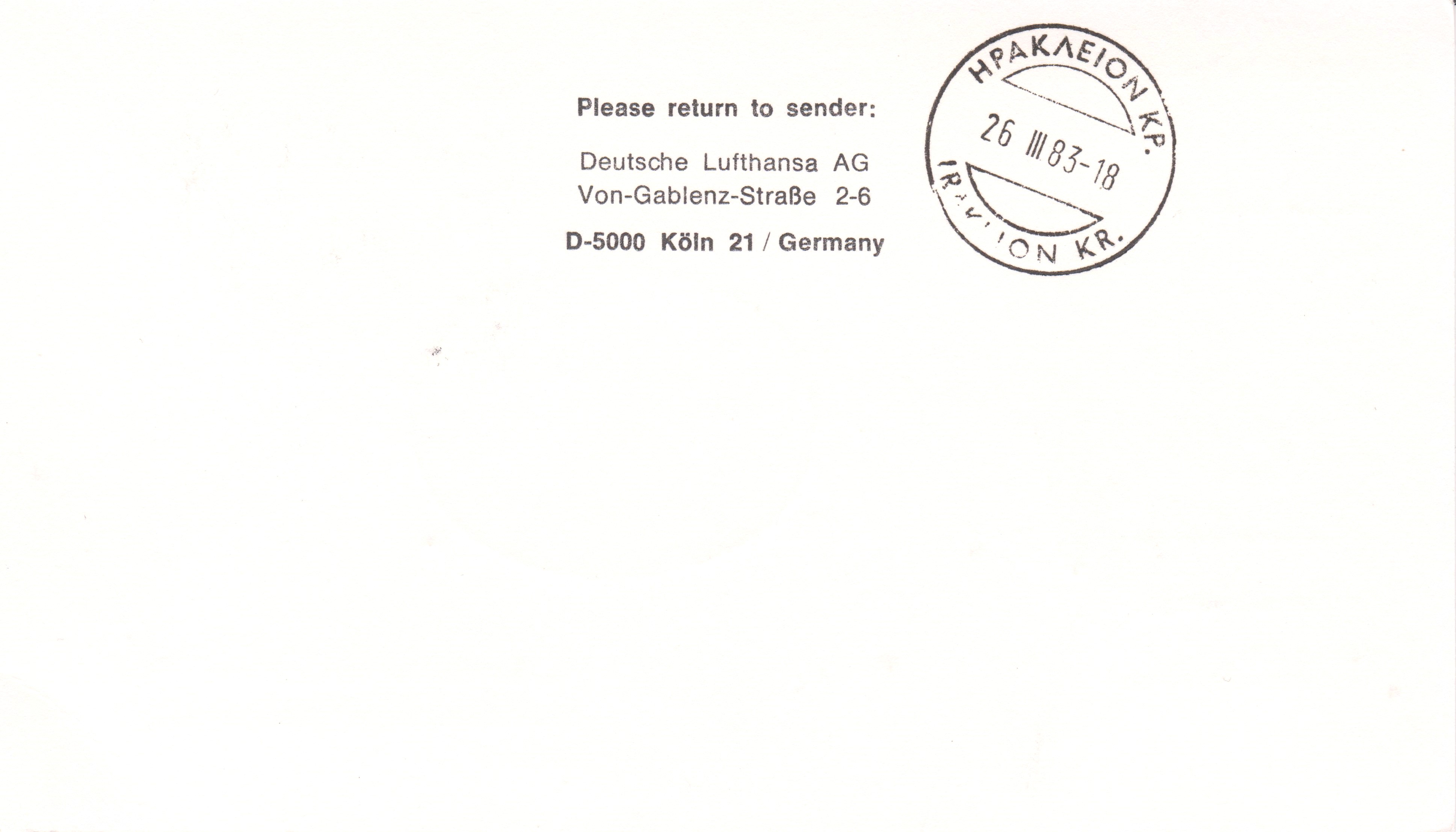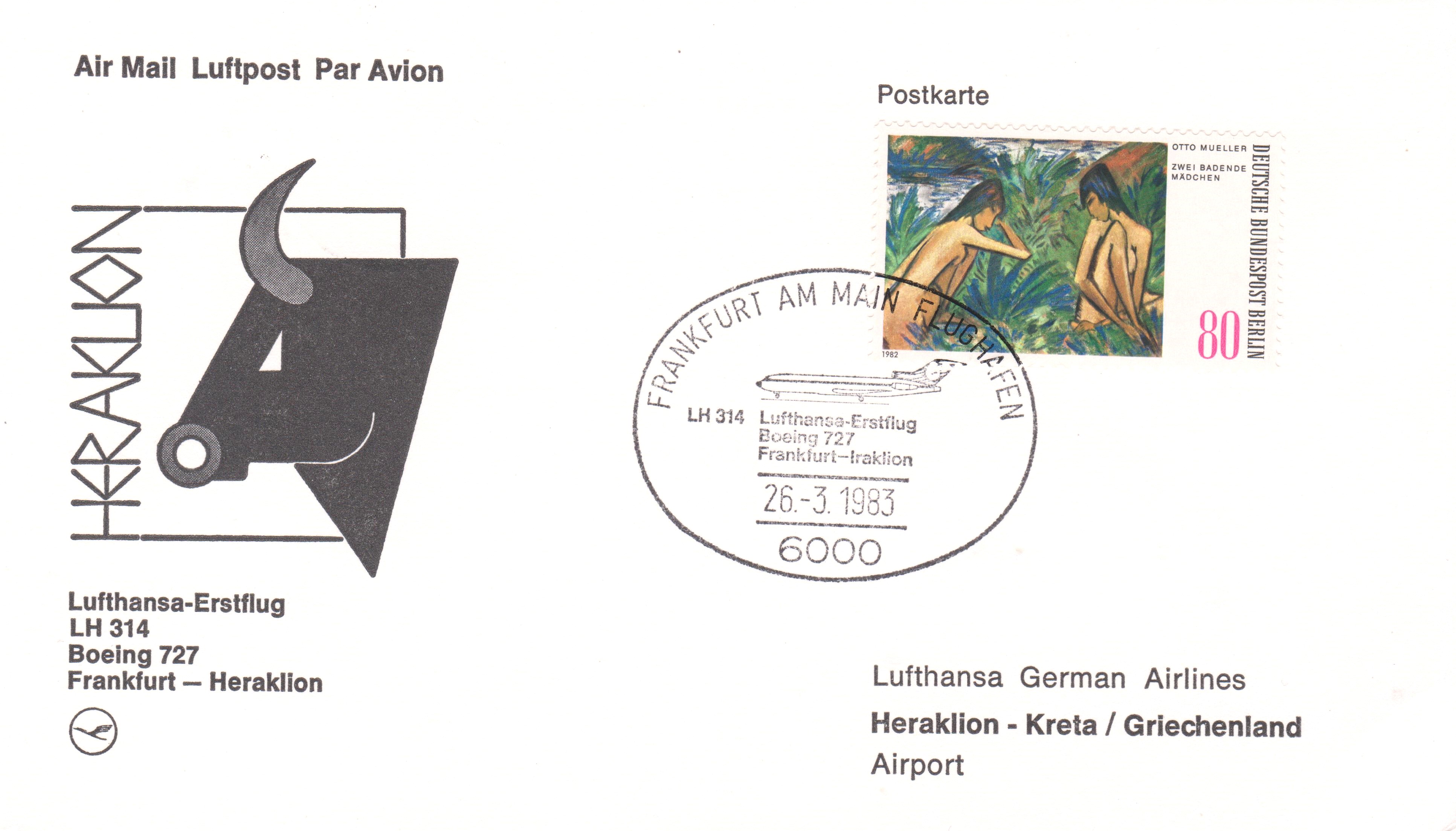 Diese Luftpost-Postkarte wurde mit einer BOEING 727 auf dem Lufthansa-Erstflug LH 314 FRANKFURT AM MAIN - IRAKLION befördert: