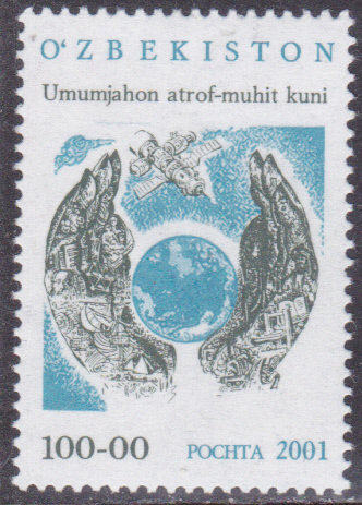 Zum Tag der Umwelt erschien 2001 in Usbekistan eine Marke (MiNr 297) mit der Abbildung "Hände mit Erdkugel und Raumstation".